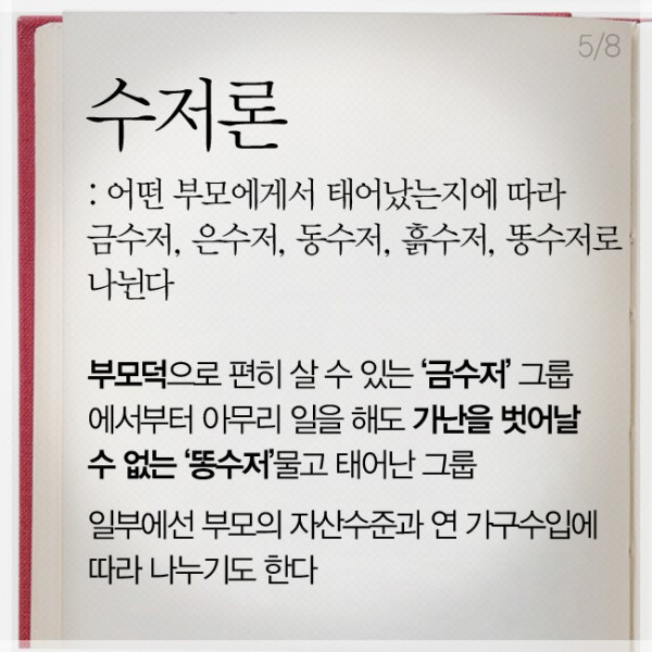 대한민국에서 2015년경부터 자주 사용되고 있는 사회 이론이다. 영어 표현인 '은수저를 물고 태어나다.'(born with a silver spoon in one's mouth)에서 유래한 것이며, 유럽 귀족층에서 은식기를 사용하고, 태어나자마자 유모가 젖을 은수저로 먹이던 풍습에서 유래한 말이며, 태어나자마자 부모의 직업, 경제력 등으로 본인의 수저가 결정된다라는 이론.