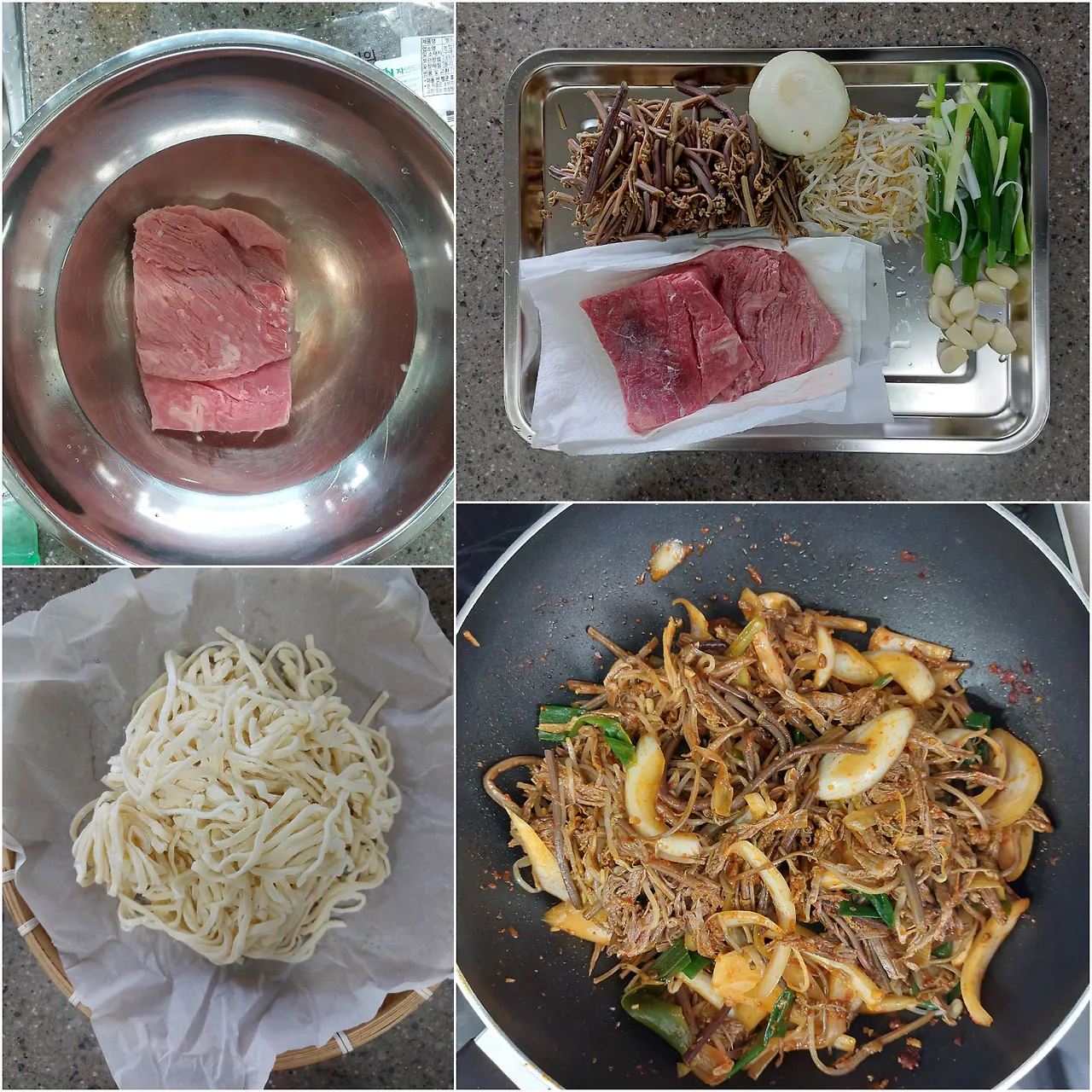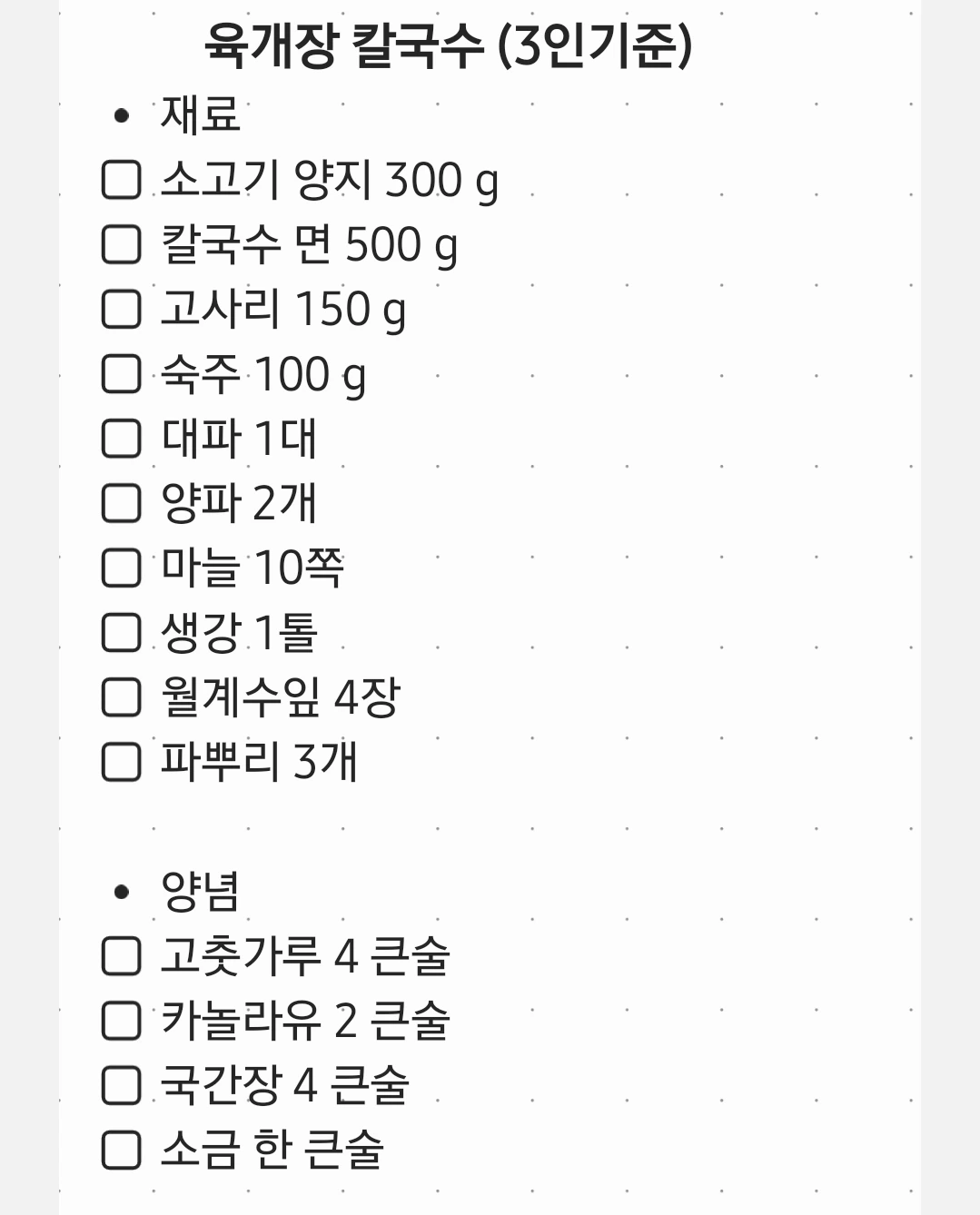 • 조리순서 1. 소고기 양지를 찬 물에 담가 30분간 핏물을 빼낸다. 2. 숙주나물은 씻어서 물기를 빼주고, 고사리를 물에 헹구어 물기를 짜준 다음 4 cm 크기로 잘라준다. 3. 깨끗이 씻은 대파는 4 cm 크기로 자른 뒤 사등분해서 자르고, 양파도 채 썰어 둔다. 4. 끓는 물에 고사리를 3분간 데친 뒤 찬물에 씻어 물기를 짜주고, 숙주나물과 대파도 끓는 물에 10초 간 데치고 물기를 빼준다. 5. 냄비에(속이 깊은) 월계수 잎과 파뿌리, 생강, 마늘, 양파를 넣고 물이 끓어오르면 소고기 양지를 넣어 30분 동안 삶는다. 6. 고기를 삶는 동안 고춧가루를 물에 개어 준 뒤, 중불로 예열된 프라이팬에 카놀라유를 넣고 고춧가루를 볶아 고추기름을 낸다. 7. 삶은 고기를 건져낸 뒤 결대로 잘게 찢는다. 삶은 고깃물은 건더기를 걸러내고 육수로 쓴다. 8. 넓은 볼에 데친 고사리, 숙주, 대파, 양파, 다진 마늘, 잘게 찢은 고기를 담은 뒤 6의 고추기름, 국간장을 넣고 조물조물 섞어 양념이 베이도록 한다. 9. 냄비에 고기 삶은 육수를 넣고 끓기 시작하면 8을 넣고 팔팔 끓이다가 소금을 넣고 간을 하고 약불로 줄인 뒤 30분 정도 끓인다. 10. 생칼국수 면은 밀가루를 털어내고 엉키지 않게 잘 풀어 준 다음 끓는 물에 넣어 6~7분 정도 삶은 뒤 채반에 건져 찬물에 한 번 씻어 남은 전분기를 빼준다. 11. 면기에 칼국수 면을 담고 육개장 건더기부터 채운 뒤 국물을 넉넉히 붓는다.