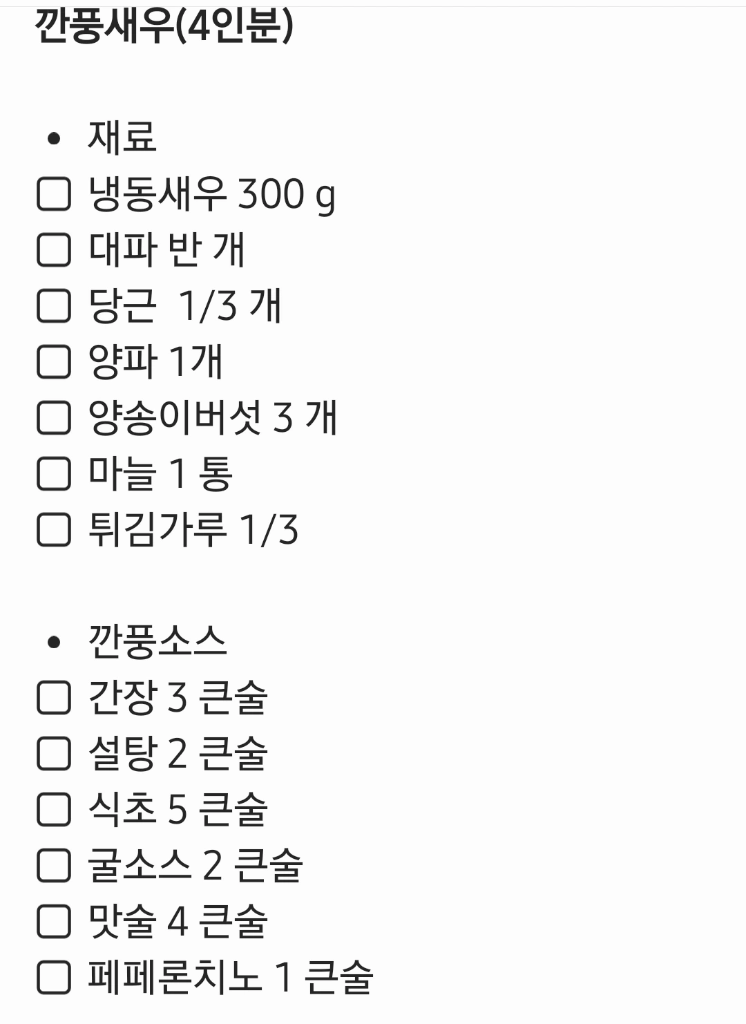 • 요리 순서 1. 냉동새우를 해동시킨 후 흐르는 물에 씻어 물기를 빼주고 키친타월로 남은 물기를 제거한다. 2. 튀김가루 1/3컵, 차가운 물 2/3컵을 넣어 잘 개어준다. 3. 야채를 씻은 뒤, 손톱 반 크기로 작게 잘라준다. 마늘은 가로로 저며준다. 4. 튀김가루 물에 새우를 넣어 골고루 섞어준다. 5. 팬에 기름을 새우가 잠길 정도로 넣고 180도로 예열한 뒤, 튀김가루 물을 조금 넣었을 때, 하얗게 튀김 꽃이 올라오는지 확인한다. 6. 팬 가장자리부터 튀기 가루 물 묻힌 새우를 조심스럽게 넣은 뒤 앞 뒤로 새우가 익으면 식힘망에 꺼낸다. 7. 기름에 튀김가루 조각이 많으면 걷어내고 새우를 200도 기름에서 한 번 더 살짝 튀긴다. (남은 기름은 식힌 후, 기름종이나 키친타월로 닦아서 버린다) 8. 궁중팬에 기름을 두르고 편 마늘과 파, 페페론치노를 넣고 센 불에서 볶다가 나머지 야채와 소스를 넣고 중불에서 볶는다. 9. 소스에 수분기가 거의 사라지면 튀긴 새우를 넣고 센 불에서 1 분간 볶는다. 10. 넖은 볼에 담아 고명을 올린 뒤, 따뜻할 때 밥과 맛있게 먹는다.