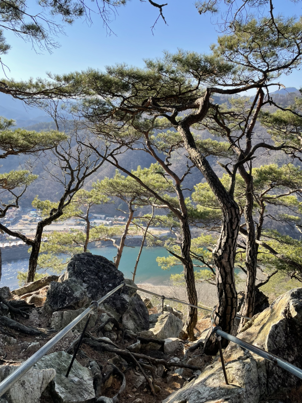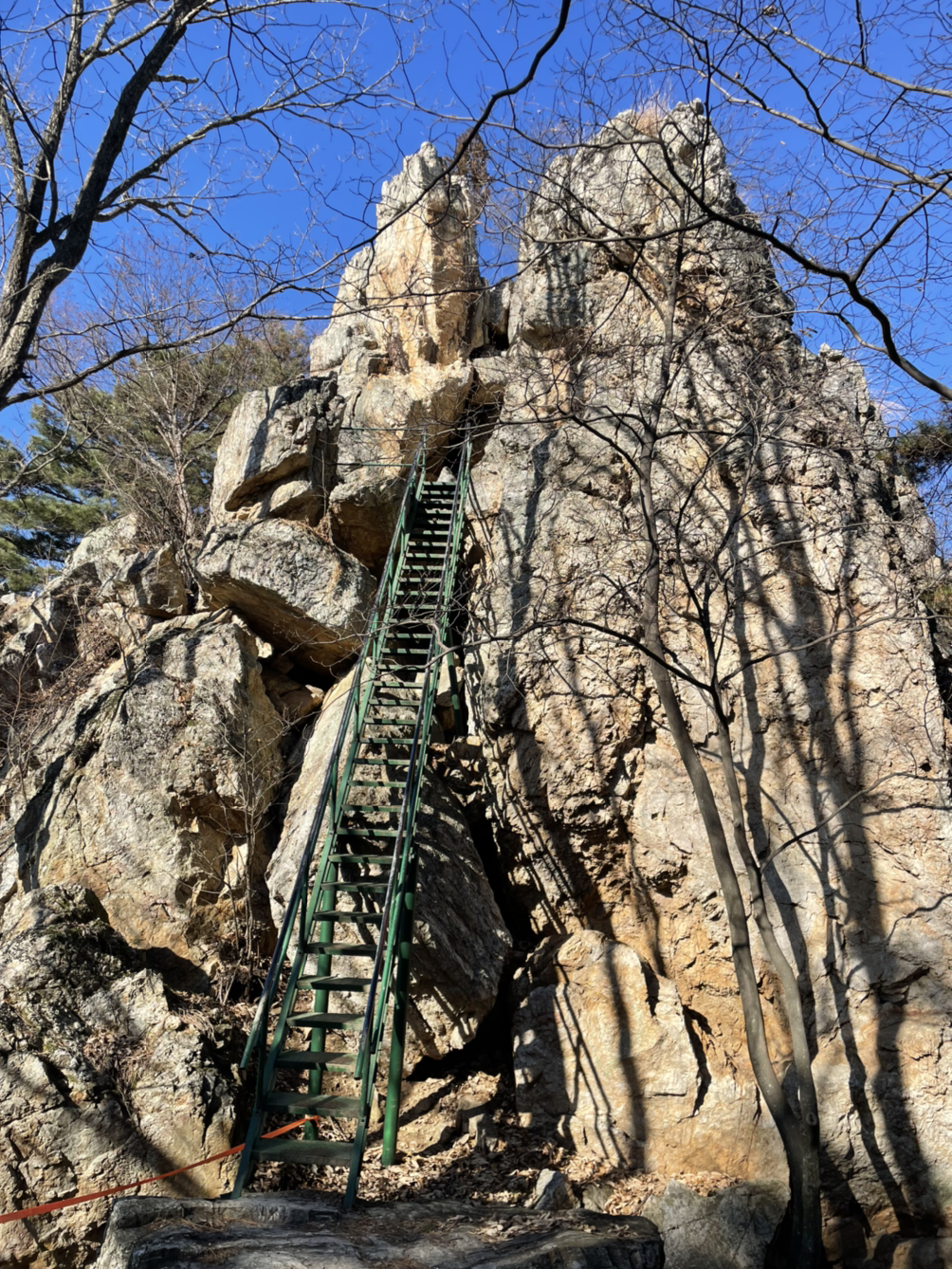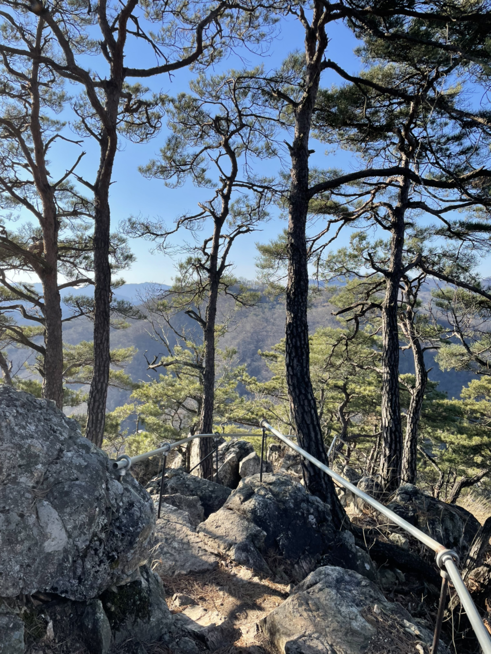 산행을 시작할 때는 스산한 날씨에 몸이 으스스했는데, 중반쯤부터 해가 나왔다. 몸도 풀리고, 날도 풀려서 산행에 적응해갈 때쯤 85도에 이르는 철계단을 만났다. 바닥이 메쉬로 되어서 발아래가 훤히 보이는데 아찔함에 절로 눈을 감게 된다.