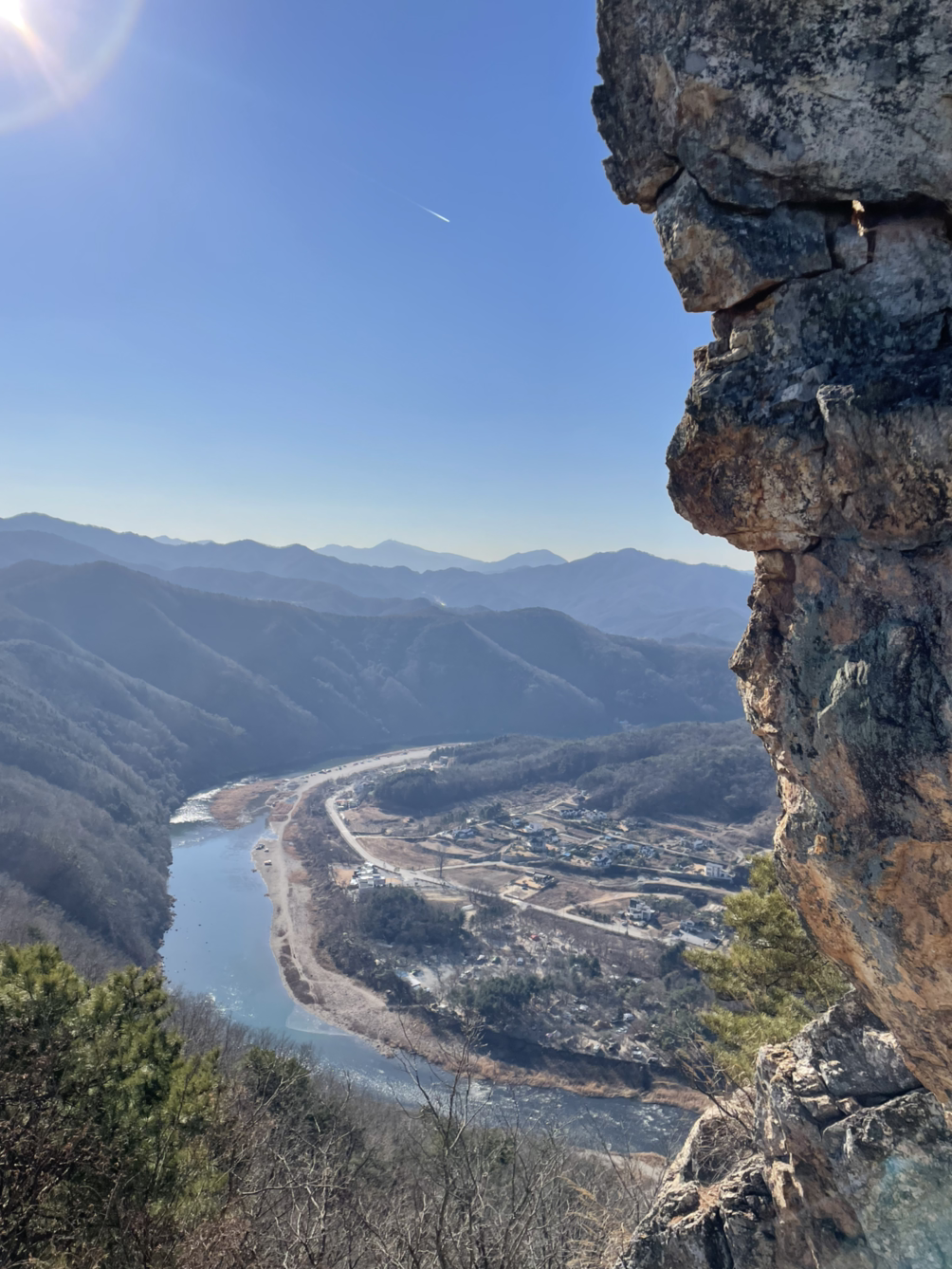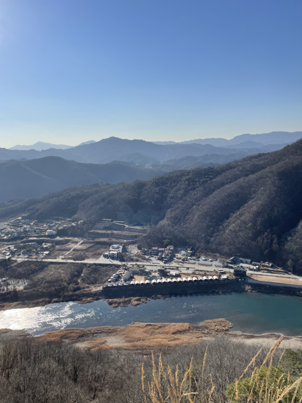 강이 이렇게 아름답구나. 땅을 딛고 서있을 때는 미처 알지 못했던 풍경이다. 익숙한 논과 밭도 산 위에서는 절경이 된다. 반짝이는 강물과 가지런히 정리된 논은 의외로 잘 어울리는 콤비다. 이런 절경을 만나면 카메라가 실물을 담지 못하는 상황이 항상 아쉽다. 그래서 열심히 찰칵이다가도 이내 핸드폰을 내려놓고 눈에 담는다.