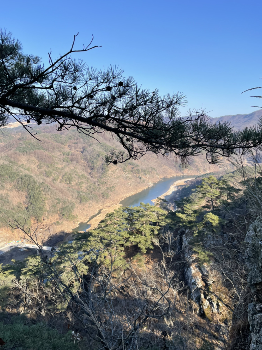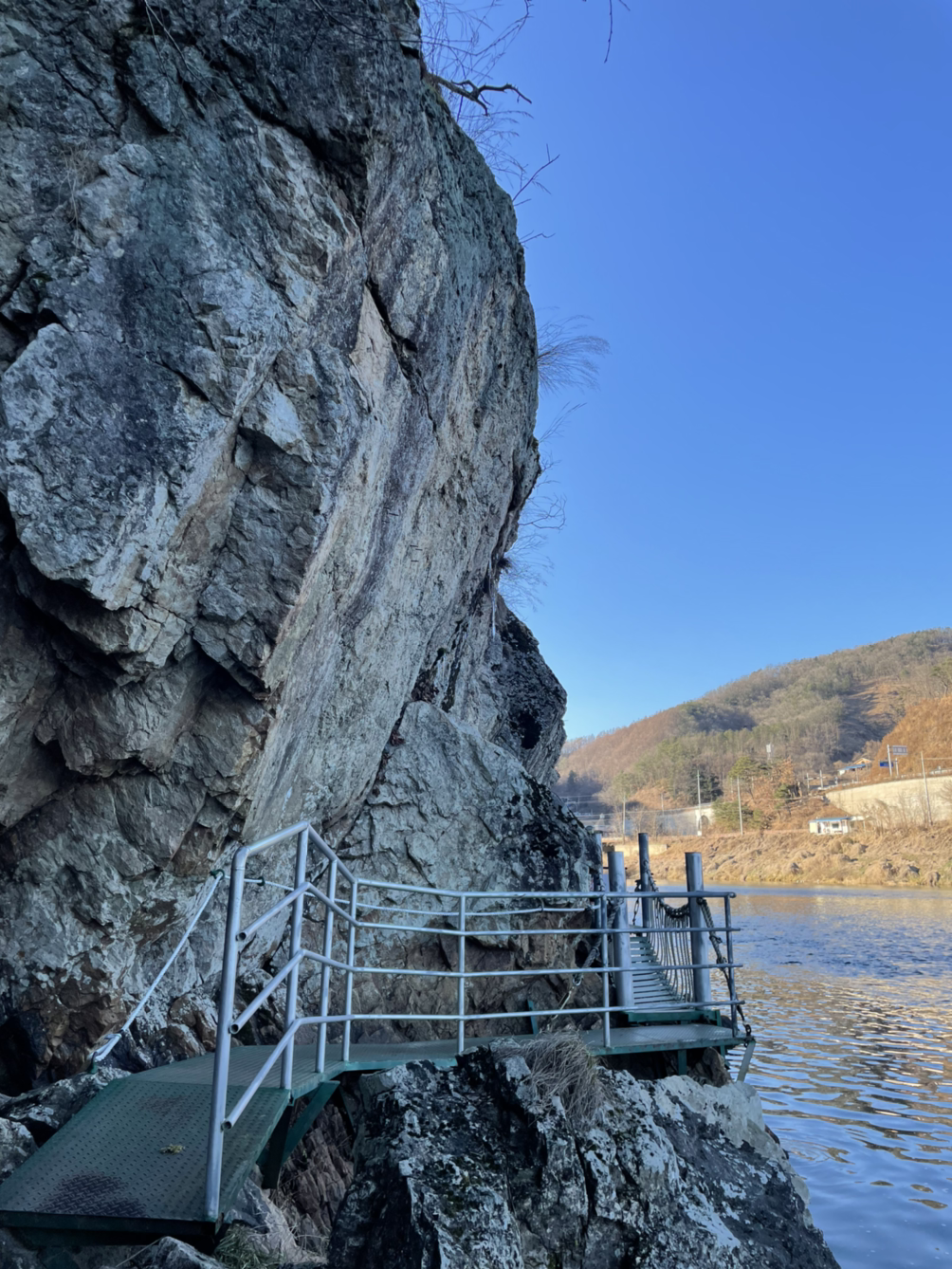 내려가는 길도 다양해서 스테이플러, 철계단, 철발판 등등 지루할 틈이 없었다. 올 겨울 처음으로 고드름을 만져보기도 했다. 하산을 완료하면 출발지점으로 가는 여정이 시작되는데 이 구간에서 나는 120% 만족해버렸다. 강가를 따라 마련된 다리를 걸으며 산행의 운치를 극대화할 수 있다.