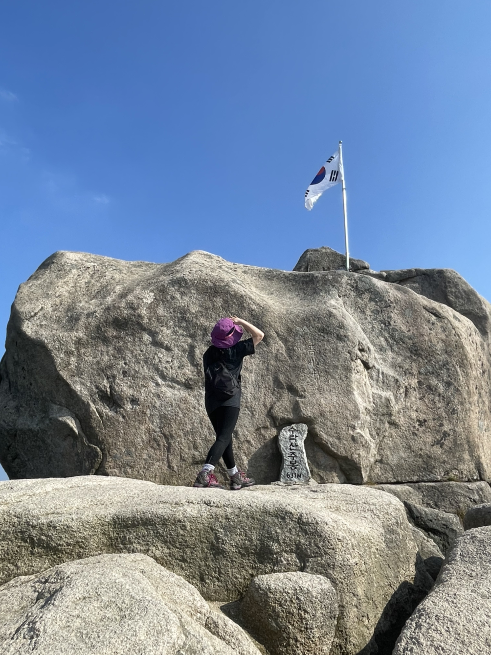 내 몸통만 한 수락산 주봉 정상석. 한글로 또박또박 새긴 필체가 정성스러우면서도 귀엽다. 자주색을 매우 좋아하는 사람의 차림으로 인증사진을 찍었다. 엄마의 등산용품을 물려받아서 그녀의 취향이 고스란히 묻어있다. 나는 자주색을 좋아하는 편은 아니다. 그럼에도 불구하고 사진은 아주 마음에 든다. 글 쓰는 현재 시점에서 태극기와 함께 찍은 주봉의 정상석이 그립다.