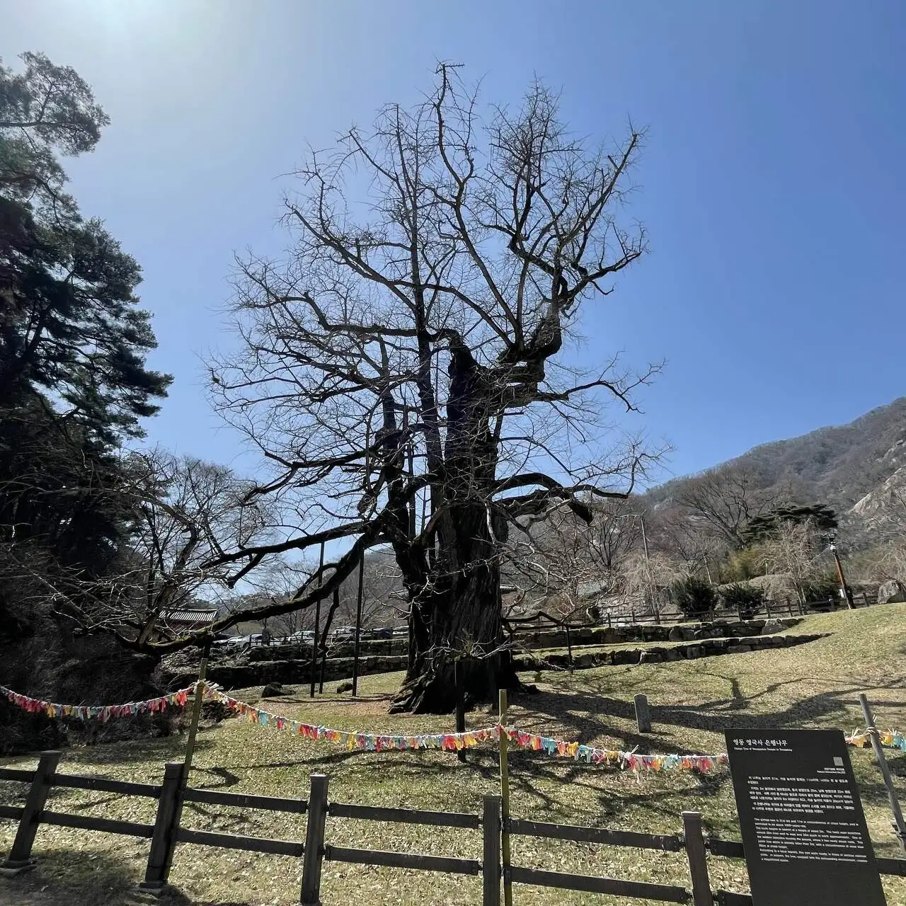 들머리를 지나 영국사로 진입하면 큰 은행나무가 반긴다. 1,000년 넘은 나무라던데. 노란 잎이 널리는 계절에 왔으면 눈이 호강했겠지만 상상으로 텅 빈 가지에 노란색을 채웠다.