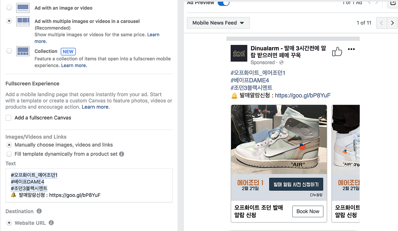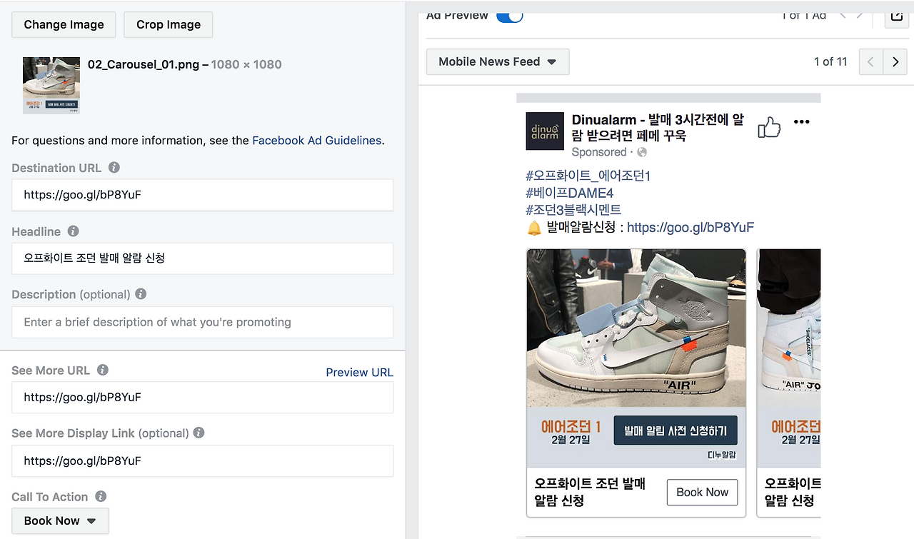 이번에는 페이스북 광고에서 굉장히 효과가 높은 캠페인 목표 '트래픽'에 대한 테스트 과정과 결과에 대한 글을 남겨보고자 합니다. 새로운 시도의 실험입니다. 기존까지는 Post engagement를 굉장히 많이 사용하고 있었습니다. 대결컨텐츠, 리셀가격표 그리고 발매알람 컨텐츠들을 미리 포스팅을 한 뒤에, 광고관리자를 통해 Post Engagement로 광고를 집행하는 방식이었습니다. 디누알람에서는 현재 가장 필요한 수치가 2가지입니다.