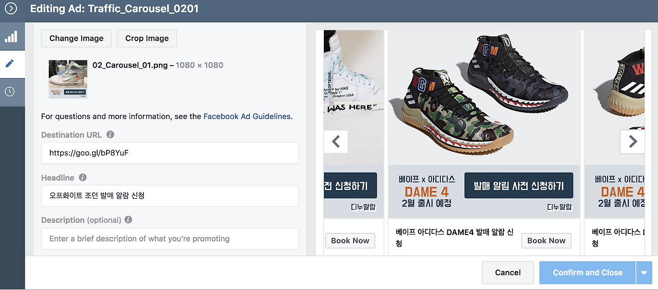 Post Engagement 광고를 통해서는 위 두가지를 모두 만족시키기가 쉽지가 않았습니다(대결 컨텐츠에서의 메신저링크를 제공함으로써 메신저 구독자 숫자는 어느정도 들어오고 있긴하였지만, 만족할만한 숫자는 아니었습니다.). 이에 따라 새로운 캠페인 목표를 가지고 진행하고자 하였고, 그것이 바로 #Traffic 입니다.