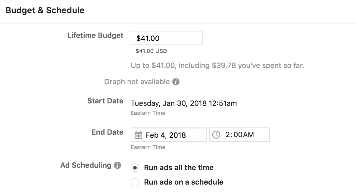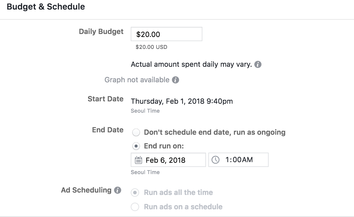 예산은 일정기간 총 예산으로 집행하였으면 $41,$20로 책정하였습니다. 그리고 기간은 약 5일간 진행하였습니다(집행기간중 1일은 일시중지를 하였습니다.) 그리고 광고의 집행 시간은 모든 시간으로 집행하게 되었습니다. 사실, 예산에 대한 부분을 어떻게 할까 테스트를 하고자 했습니다. 집행기간에 대한 부분은 4일간은 진행하여야 광고주들에게 맞는 유저들이 발견된다는 팁을 얻었고, 그에 따라 4일 이상으로 기간을 두었습니다. 4일 이상으로 설정해줘야 페이스북 광고 시스템에서 머신러닝을 통한 광고주에 적합한 유저들을 찾아준다고 하네요.