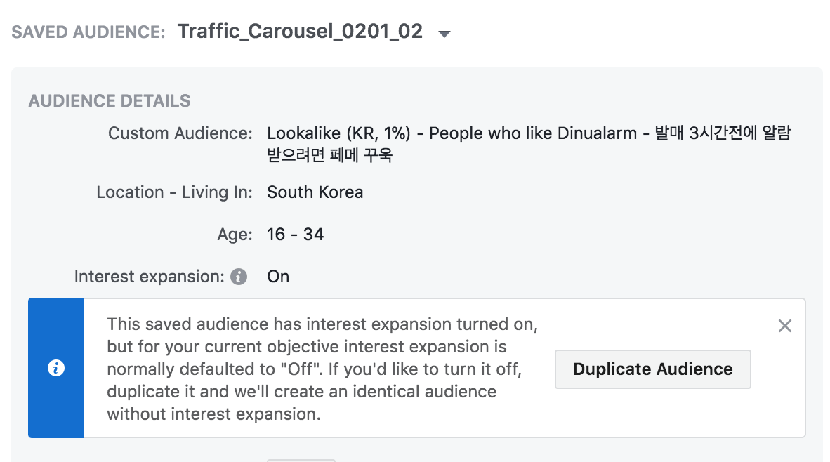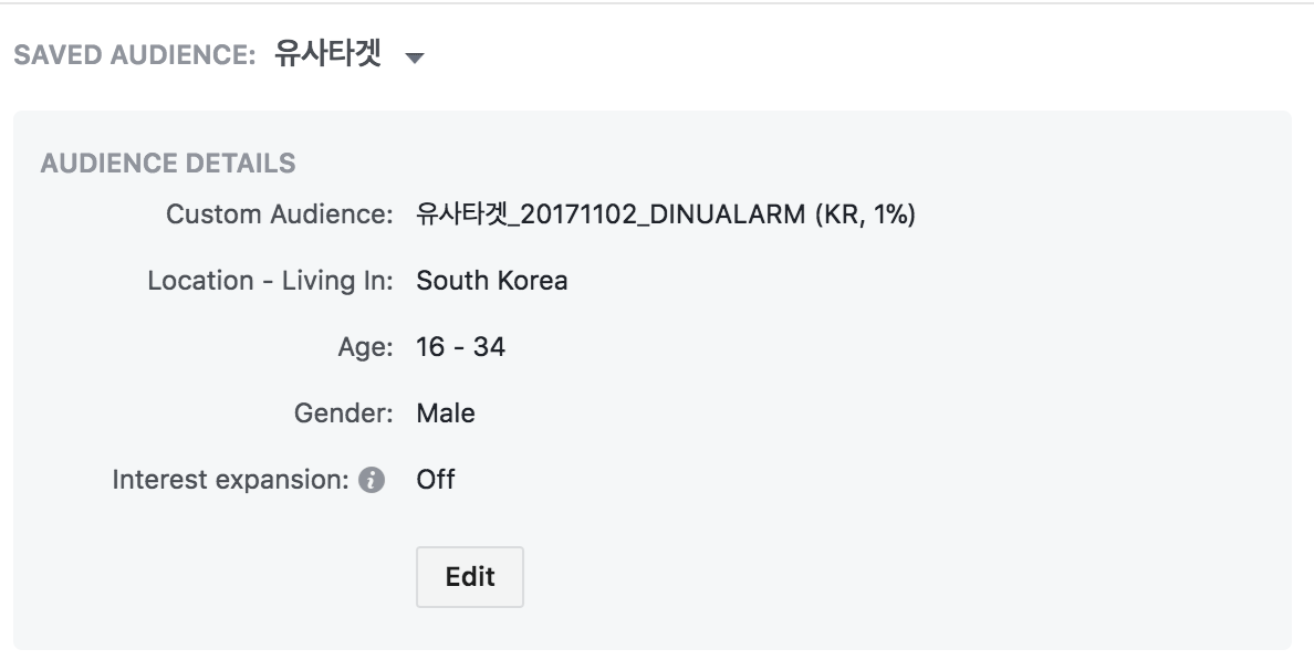 우선 기본적으로 타겟설정을 하는데부터 시작했습니다. 기존 저희가 가지고 있던 타겟들을 저장해놓았습니다. 기존 타겟을 기반으로 하여 유사타겟을 설정하였습니다. 유사타겟은 기본적으로 1%로 집중하여서 더 적은 금액을 이용하여 밀도높은 타겟팅을 진행하였습니다. 이후, 인구통계학적인 요소를 설정하였습니다. 디누알람은 스니커즈 제품에 대한 컨텐츠를 제공하고 있기에 양끝단의 연령대를 모두 낮추었습니다. #16세-34세 로 설정하였습니다. 그리고 성별은 모든 성별로 진행하였습니다(기존 연령대가 남성으로 되어있고, 워낙 컨텐츠가 남성에게 더 끌리는 컨텐츠여서 결과값은 남성으로 다 몰리긴하였습니다.). 또한, 관심사는 설정하지 않았습니다. 이 부분에 대해서는 Facebook Marketing Expert 프로그램의 컨설팅으로부터 받았던 조언이었습니다. 오히려 관심사를 선택하지 않았을 경우 잠재적인 유저들을 만날 가능성이 높다고 하였습니다. 아직 이 부분에 대해서는 조금 의외라고 생각하고 있습니다.