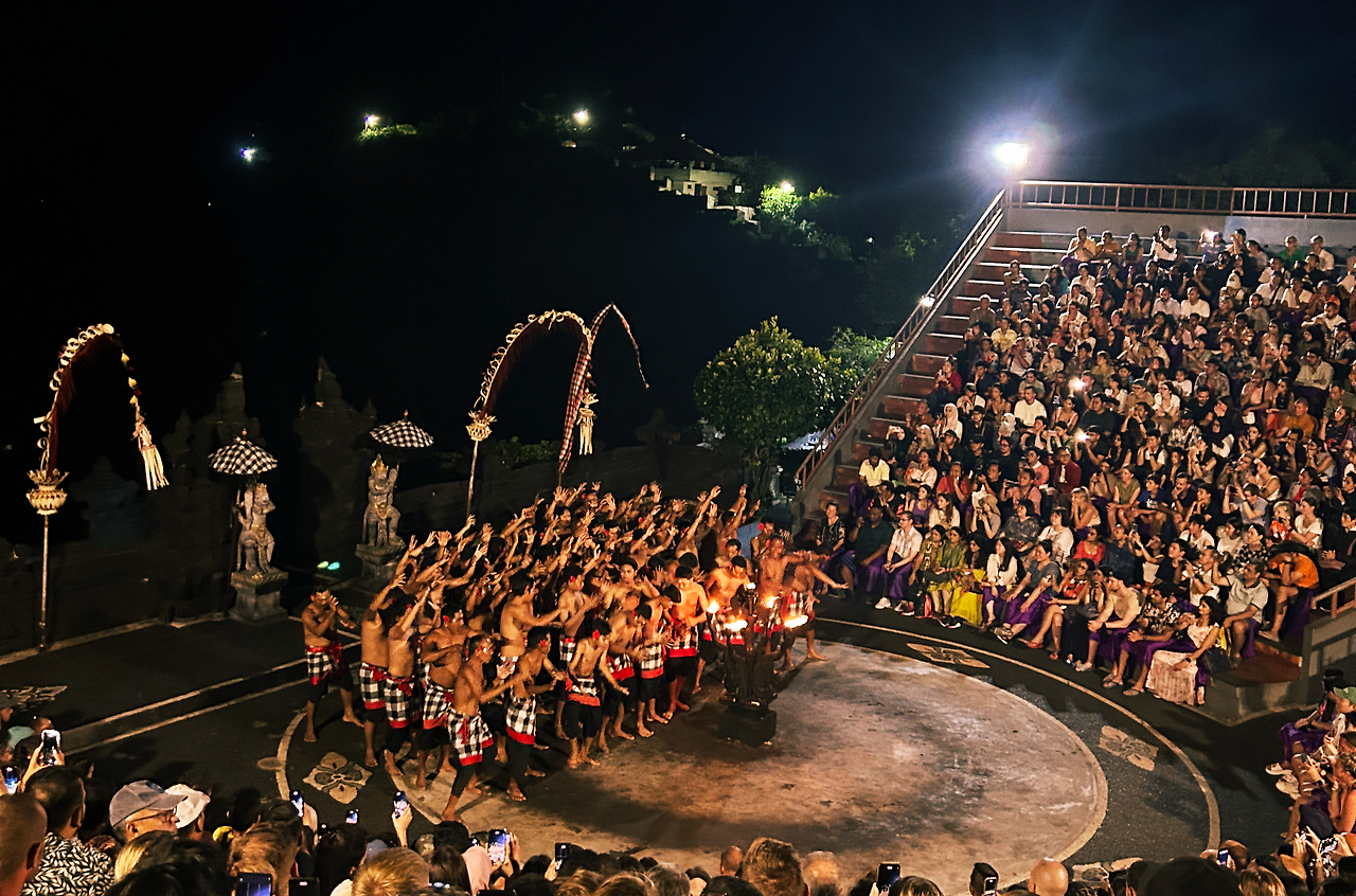 착잡한 기분을 느끼며 30분가량의 무질서한 기다림이 끝에 드디어 오늘의 하이라이트인 께짝 댄스 공연장으로 들어설 수 있었다. 붉은 석양이 모습을 감추고 사위가 깜깜해진 시간, 웃통을 벗은 수십 명의 남자들이 께짝 께짝 소리를 내며 공연장에 입장했다. 중앙을 보고 둥글게 앉아 몸을 들썩 거리며 원숭이를 연기하는 무용수들이 발리의 오래된 이야기의 서막을 열었다.