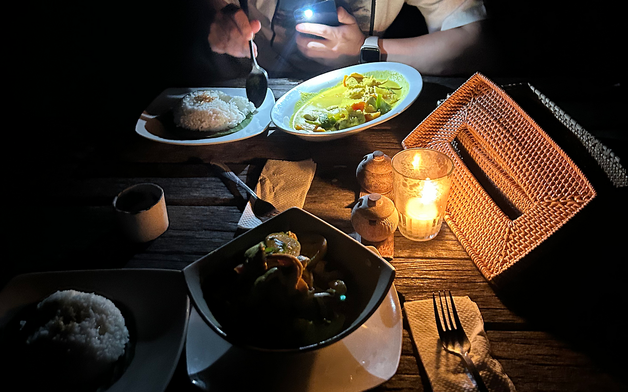 숙소에서 그나마 가까운 식당에 도착해 테라스에 자리를 잡고 음식을 주문하고 있으니 갑자기 주변 일대 모두 암흑이 되었다. 좀있다 다시 켜지겠지라는 기대와 달리 음식이 서빙될 때까지 오래도록 전기가 들어오지 않는다. 촛불 몇개에 의지해 위태롭게 주문한 음식을 들고오는 직원에게 괜찮냐고 물으니 안괜찮아하면서 답한다.