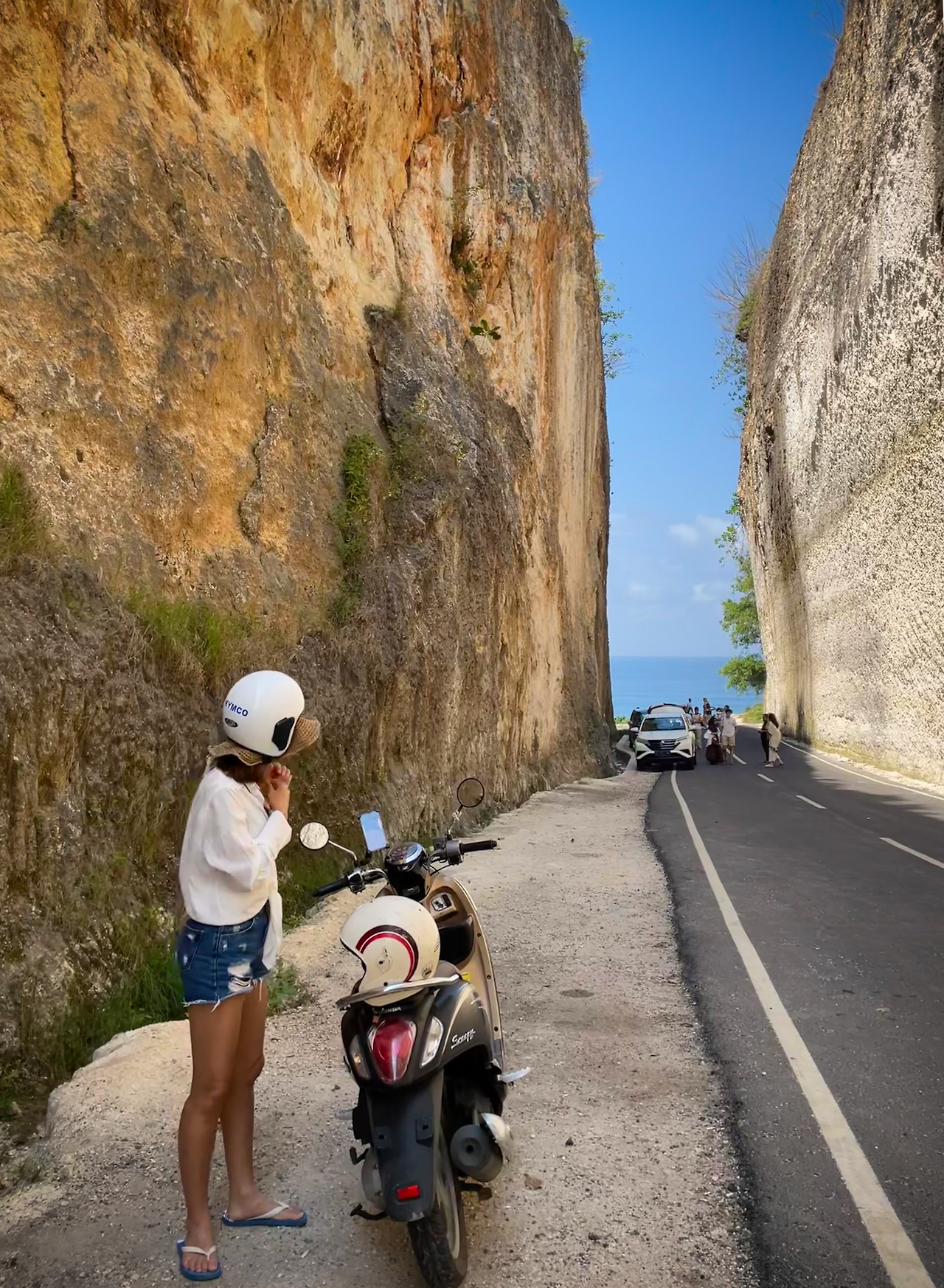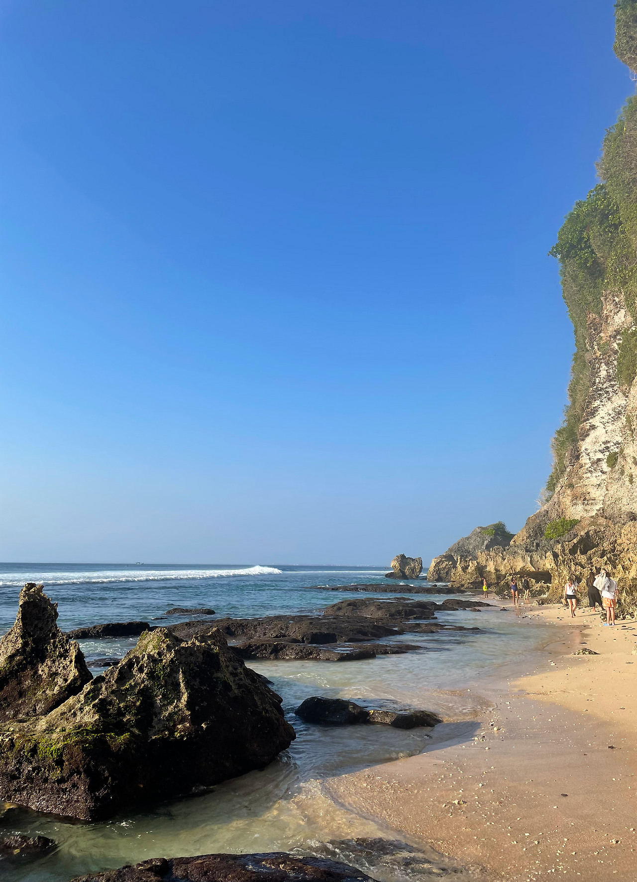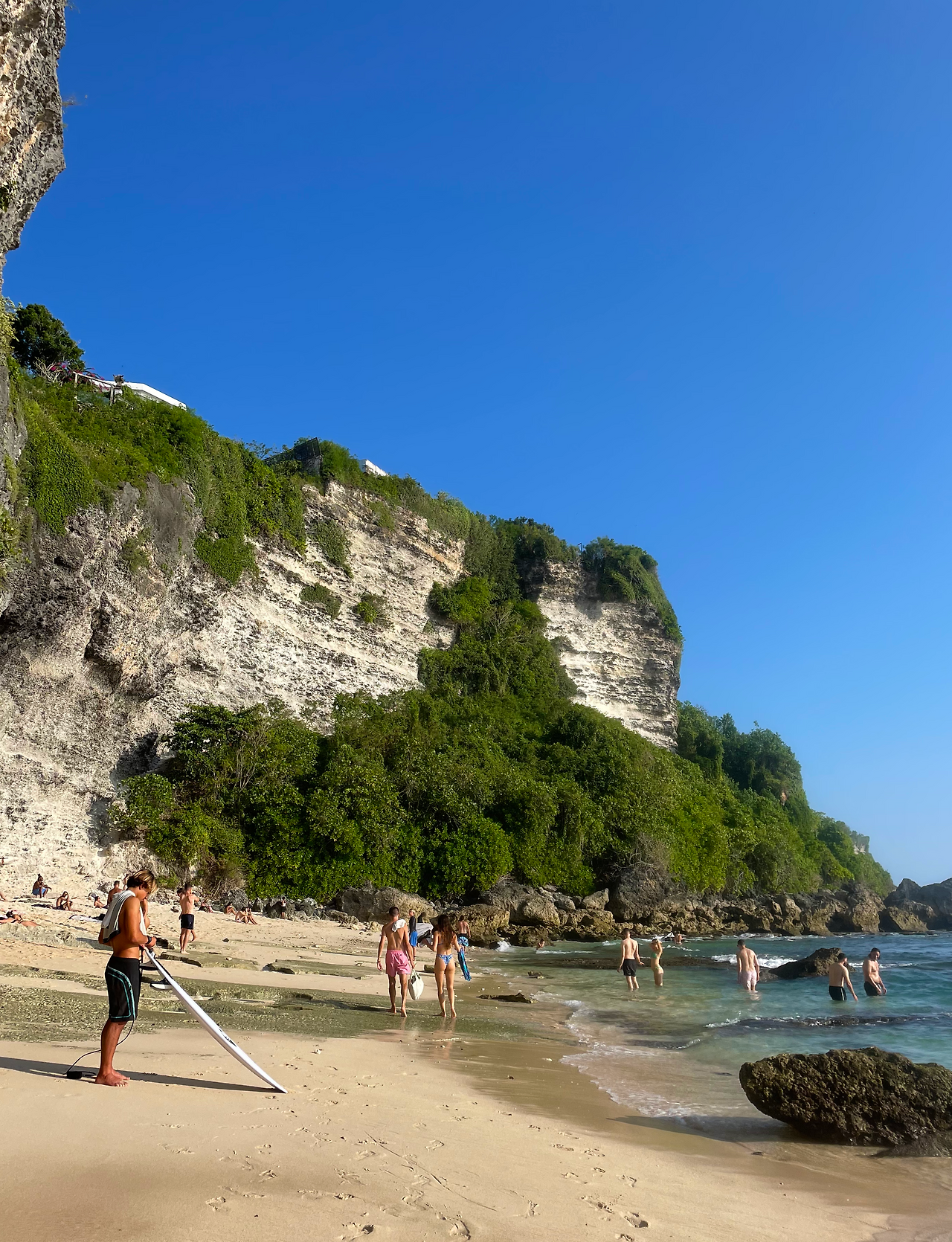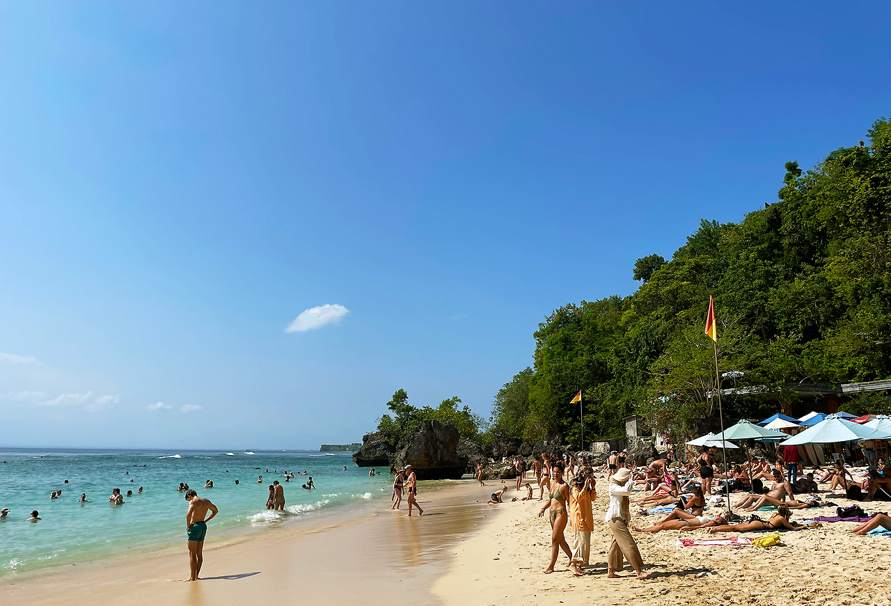 같은 코스로 한번 와 봤던 터라 어려움 없이 도로를 질주하며 눈여겨봐 둔 핫한 식당에서 점심을 먹고 J와 못 갔던 빠당 빠당 비치로 향했다. 유명한 곳이라 그런지 확실히 토마스 비치보다는 정비가 잘 되어 있었는데 길게 이어진 계단을 내려가니 절벽을 끼고 있는 작은 해변이 나타났다. 해변에는 이미 많은 관광객들이 비치 타월을 깔고 일광욕을 즐기고 있었는데 그 모습이 매우 이국적이었다.