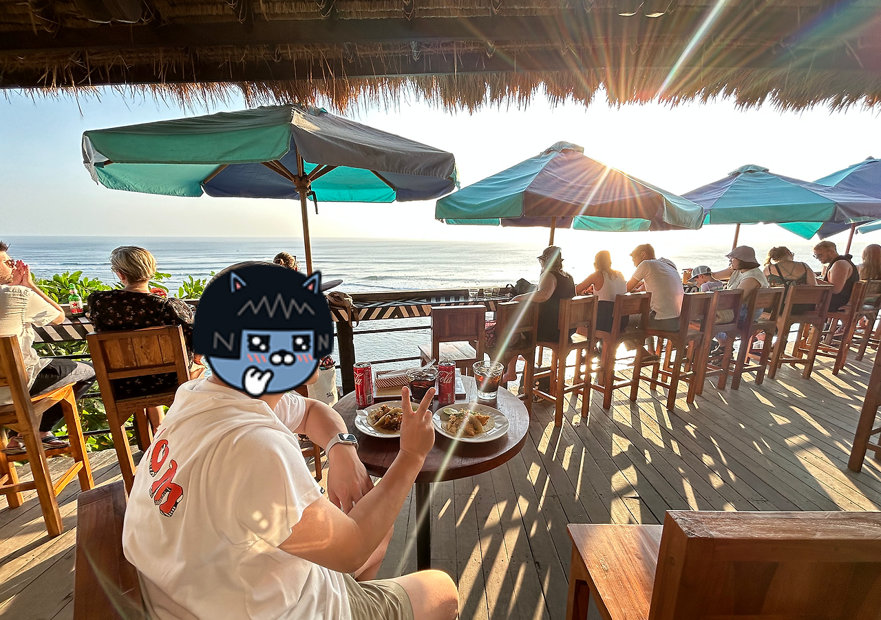 울루와투 사원으로 이동하기 전 이른 저녁을 해결할 겸 이곳에서 유명한 싱글핀 레스토랑으로 자리를 옮겼는데 해 질 시간이 아직 많이 남았음에도 테이블이 거의 만석이었다. 운 좋게 하나 남은 테이블에 앉아 타코를 주문하고 넓게 펼쳐진 바다를 감상했다.