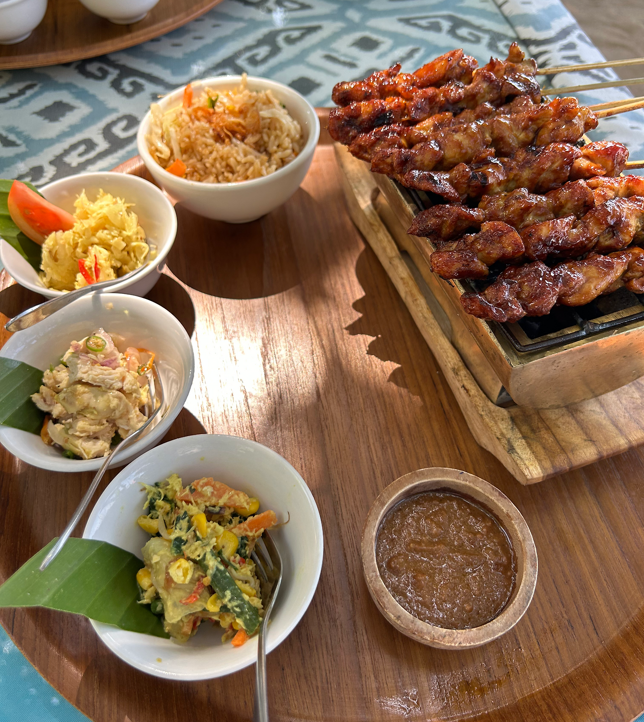H가 내 코코넛을 아작내고 있을 때 주문한 음식이 도착했다. 여러 가지 반찬과 화로에 올려진 사테세트에 H가 매우 흡족해하며 눈을 빛냈다.