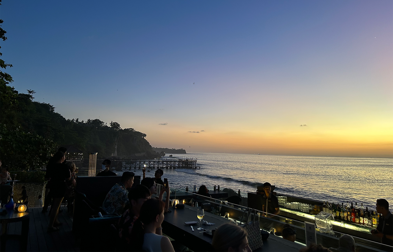 드디어 드넓은 수평선 너머로 해가 넘어가며 하늘과 바다를 붉게 물들였다. 바에 앉은 연인들이 로맨틱하게 와인을 부딪히고 여기저기서 아름다운 풍경을 배경으로 사진을 찍기에 여념이 없었다. 몇 번이나 선셋을 감상해서 그런지 이곳이 특별히 더 감동적이지는 않았지만 우리를 위해 락바를 예약해 준 동생 부부와 시간을 보내는 것에 의미를 두며 H와 함께 우리도 열심히 인증샷을 찍었다.