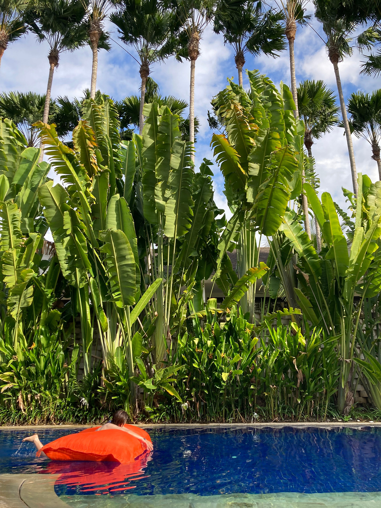 잠시 무수리가 된 것 같은 기분을 뒤로하고 선베드에 누워 책을 보려는데 가져온 아이패드가 너무 무겁다. 조카에게 빼앗긴 패드 미니가 그리웠지만 무릎을 세워 어찌 저찌 각도를 맞춰서 한 자 한 자 집중하려는데 패드 뒤로 보이는 풍경이 아주 어여쁘네? 파란 하늘을 배경 삼아 바람에 흔들리는 바나나 잎과 야자수를 보다 보니 한참이 지난 것 같다. 흘깃 옆을 보니 J는 이미 킨들로 독서 삼매경. 킨들을 사야 하나 생각하며 고개를 드니 어쩐지 흘러가는 구름도 예쁜 것 같네? 잠깐 시선을 준 것 같은데 또 한참이 지났다.
