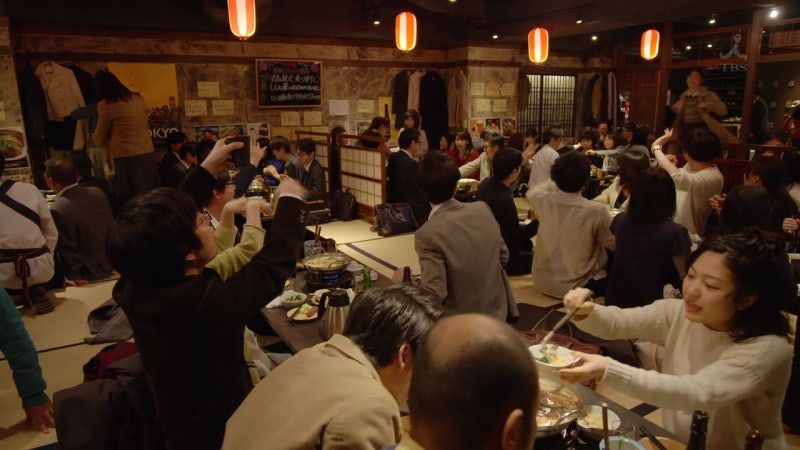 일본 드라마를 본 적 있는 사람이라면, 회사원들이 모인 회식 장면이 나오는 것을 심심찮게 볼 수 있었을 것이다. 우리나라도 드라마를 보면 회식 장면이 종종 나오지만, 일본의 회식 장면을 보면 왠지 똘똘 뭉친 단합심을 느낄 수 있어 보인다. '건빠이!'를 외치면서 정장을 입은 사람들이 취해있는 모습을 쉽게 상상할 수 있다.