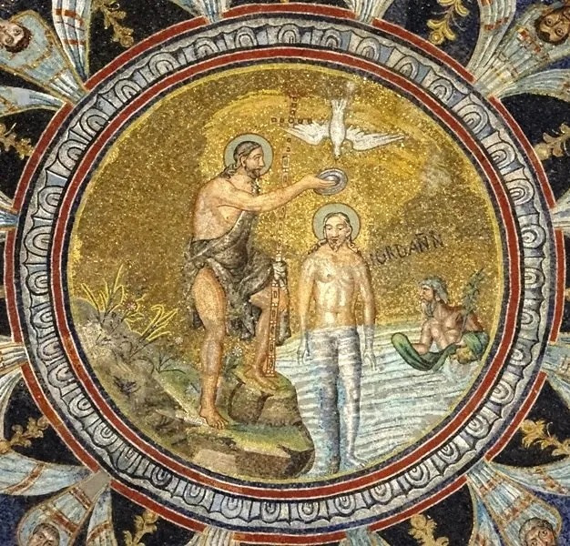 <예수 그리스도의 세례도>는 5세기 중엽 라벤나의 정교도 세례당의 원대 천정 중앙에 장식된 모자이크이다. 모자이크의 구성은 돔(Dome)의 중앙에 세례도를 그린 후 그 주위를 또 열두 사도들의 행렬을 원 형태로 일정한 간격으로 배열하여 통일감을 유지시키고 있다. 그려진 내용은 신약성서 4 복음에 기록된 말씀을 주제로 한 것이다.