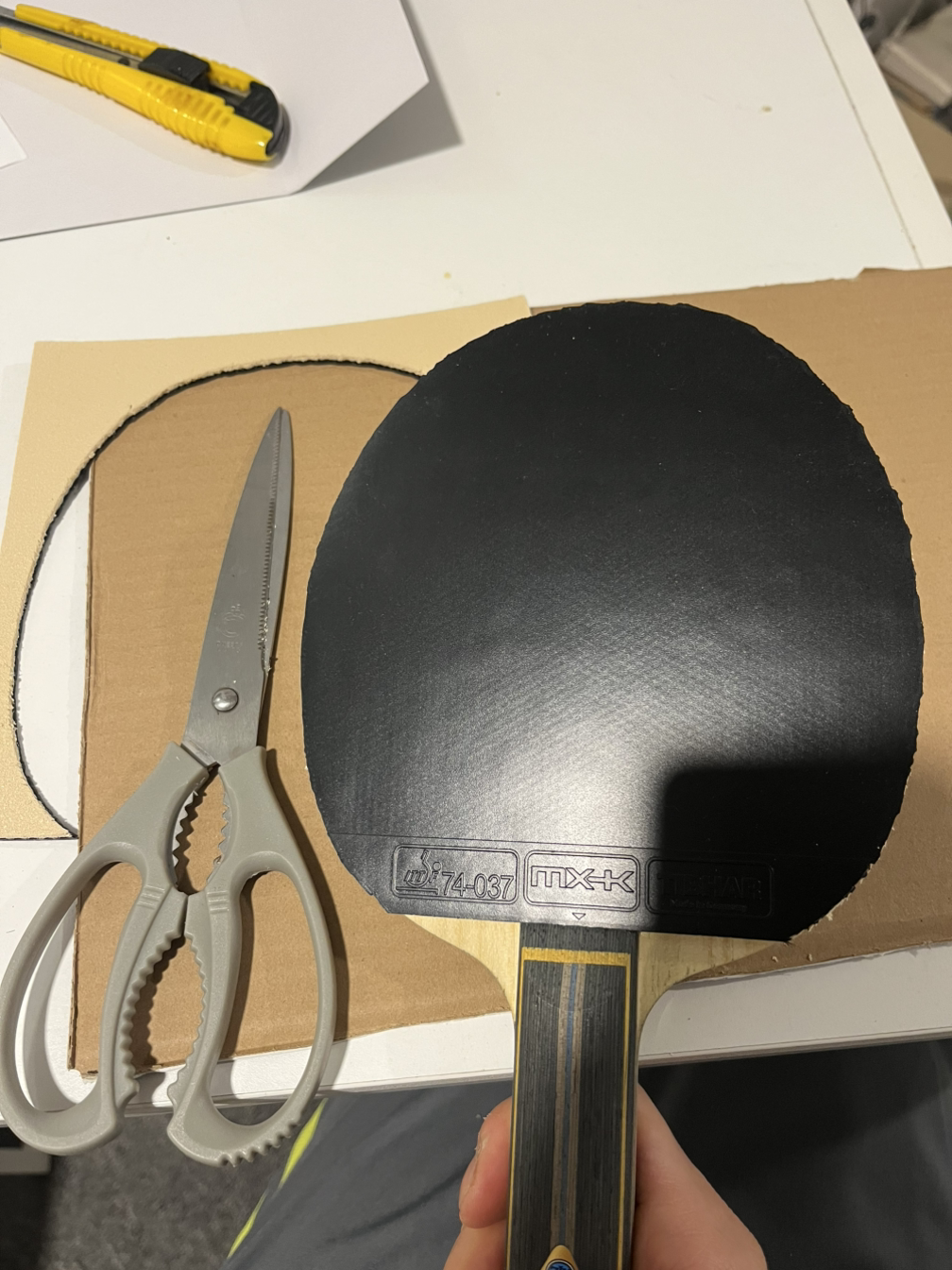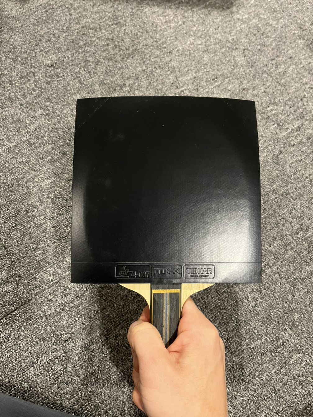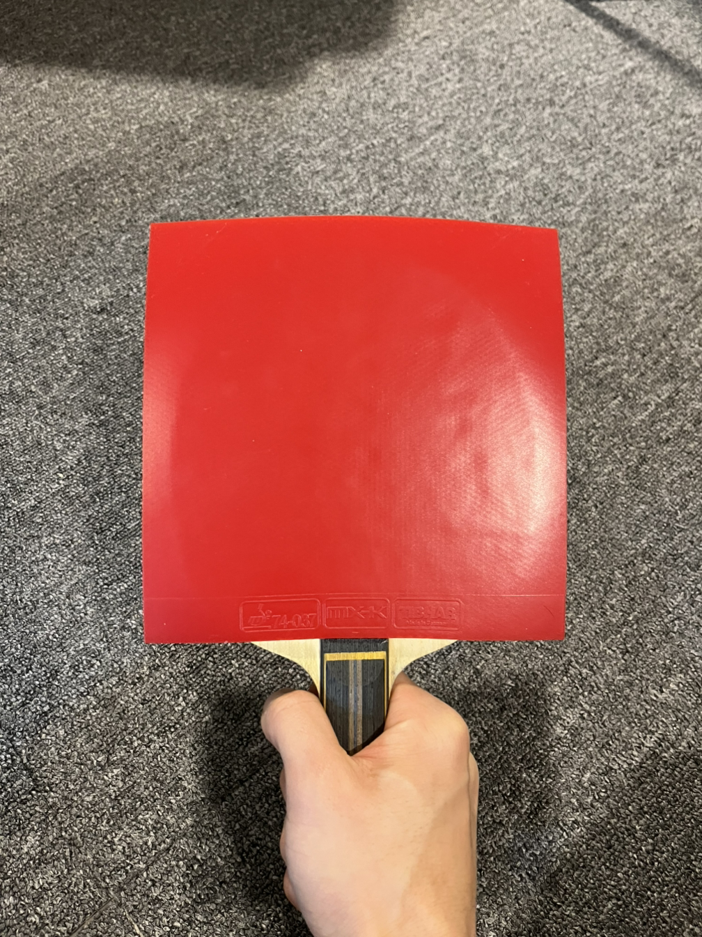 러버와 라켓이 마르면 전면부 부착에 들어간다. 라켓 손잡이의 상단에 러버 끝부분을 수평으로 맞춘 후 러버를 가볍게 내려준다. 붙이면서 힘을 줘버리면 러버가 밀리면서 붙을 수도 있다. 그래도 처음치고는 중간에 뜬 부분 없이 잘 붙였다. 날이 선 칼을 가지고 라켓 끝에 맞춰 자르려는데 제대로 잘리지 않는 것 같아, 하는 수없이 가위로 바꾸었다. 최대한 보기 좋게 라켓 끝선에 맞추어 잘랐다. 오돌토돌한 부분이 눈에 띄지만 크게 이상이 없을 것 같다. 포핸드는 이것으로 끝을 낸다.