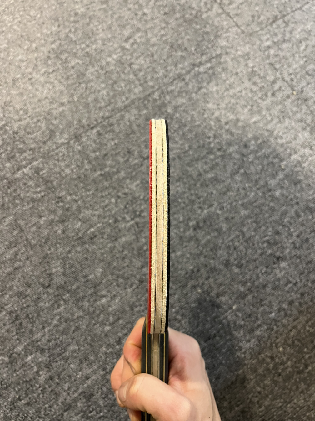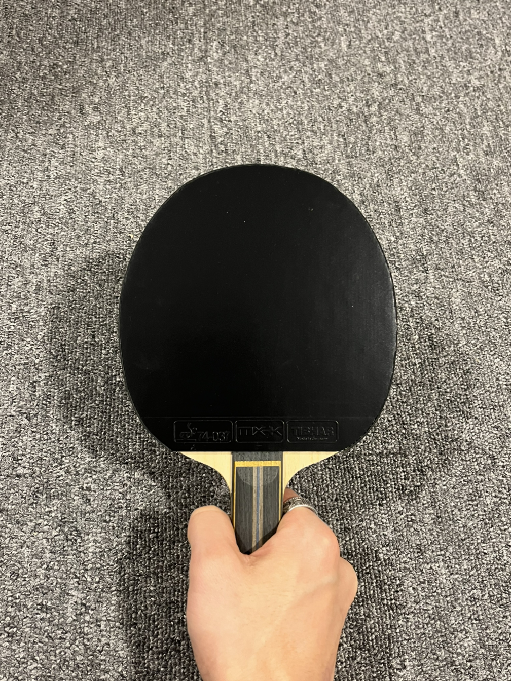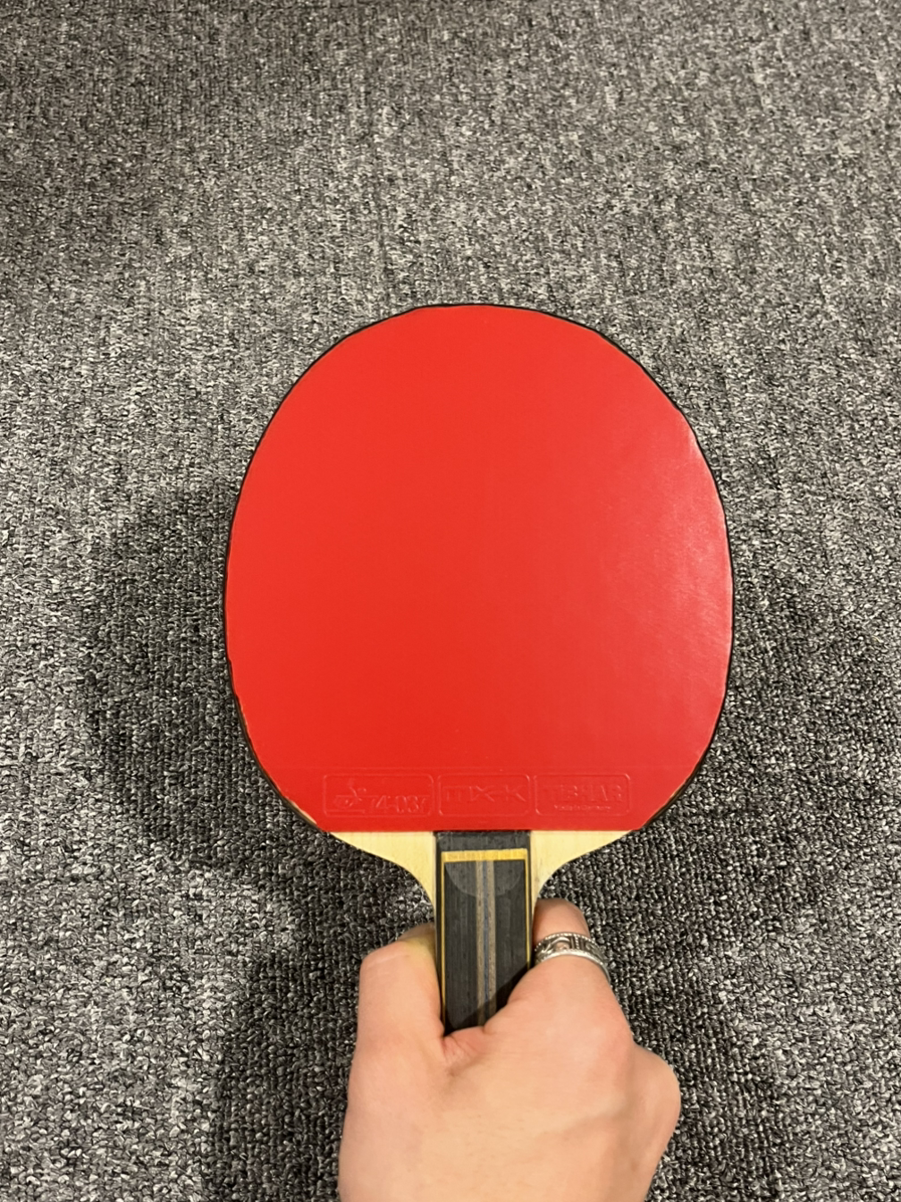 러버와 라켓이 마르면 전면부 부착에 들어간다. 라켓 손잡이의 상단에 러버 끝부분을 수평으로 맞춘 후 러버를 가볍게 내려준다. 붙이면서 힘을 줘버리면 러버가 밀리면서 붙을 수도 있다. 그래도 처음치고는 중간에 뜬 부분 없이 잘 붙였다. 날이 선 칼을 가지고 라켓 끝에 맞춰 자르려는데 제대로 잘리지 않는 것 같아, 하는 수없이 가위로 바꾸었다. 최대한 보기 좋게 라켓 끝선에 맞추어 잘랐다. 오돌토돌한 부분이 눈에 띄지만 크게 이상이 없을 것 같다. 포핸드는 이것으로 끝을 낸다.
