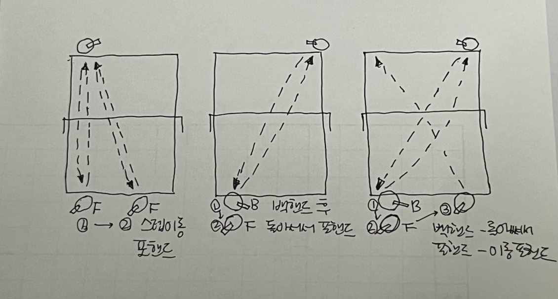 여기까지가 저번 레슨과 동일한 과정이었는데 더해서 왼쪽 모서리에서 백핸드를 치고 돌아서서 포핸드를 치는 화백 전환을 처음 배웠다. 백핸드와 포핸드를 한 번씩 번갈아 치려니 라켓을 잡은 손이 막 바뀐다. “포핸드 칠 때와 백핸드 칠 때 그립이 조금씩 바뀌나? 조금씩 바뀌는 게 맞다. 그게 자연스러워져야 하고 적응되어야 한다”라는 코치님의 말. 바뀌는 수준이 아니라 매번 새로 잡는 느낌인데요…. 이걸 어찌해야 하는지 막막해진다.