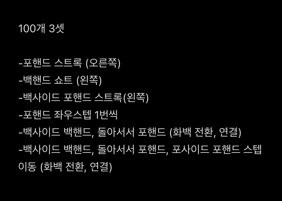 연습만이 살길이라는 것을 알면서도 꾀를 부리고 싶은 날도 생긴다. 정신을 차려야 할 때다. 혼자서도 효율적으로 연습을 하려면 어떻게 해야 할까 고민하다, 그간 배운 것들을 쭉 정리해 본다. 포핸드, 백핸드 쇼트, 백사이드 포핸드, 스텝이동 포핸드, 백핸드 후 돌아서서 포핸드, 그리고 거기에 더해 스텝이동 포핸드까지. 이전 레슨 때 코치님과 공을 나누었던 시스템을 이렇게 대략 6가지로 만들어서 2주 동안은 기계와 놀리라. 물론 저번처럼 다른 회원들의 이용에 방해가 되지 않는 선에서 말이다.