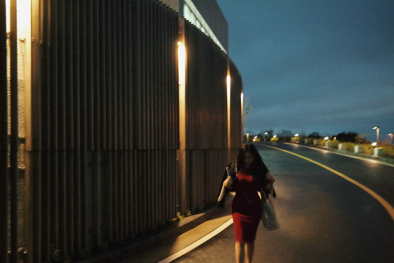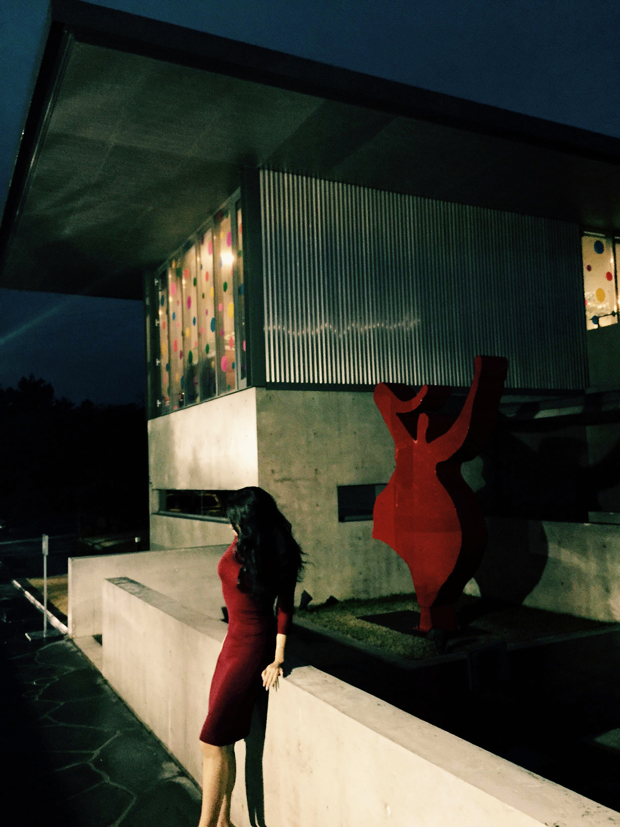 온갖 생명들이 아침이 올 때까지 제 모습을 감추고 숨을 죽이고 있는 것처럼 보였다. 체크인을 하고 나는 아무도 없는 길을 걸어본다. 모퉁이를 한번 돌자 금새 미술관에 다다른 나는 건축가 안도 타다오의 콘크리트를 살짝 맛본다. 묵직하고 차갑기만 했던 그의 콘크리트가 웬일인지 축축하다. 하늘은 푸르지도 검지도 않은 인디고색을 띠고 있었고 Gitane 의 붉은 조각 작품이 밤과 비가 겹쳐진 레이어를 입으니 내 원피스 색과 비슷해졌다.