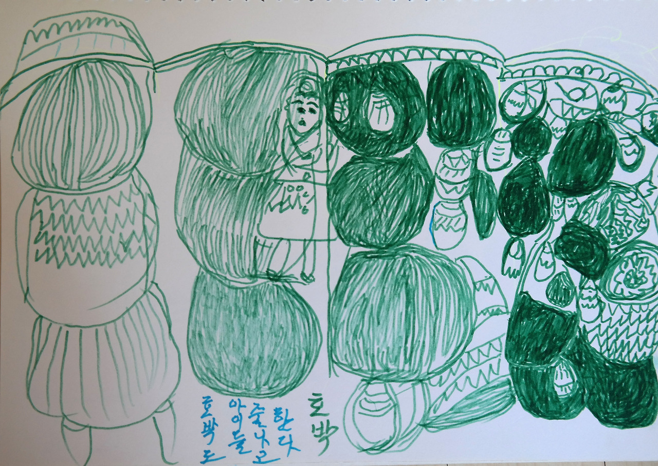 전시할 장소를 물색하고 전시 일정도 빠듯하게 잡았다. 그로부터 딱 한 달 뒤. 차곡차곡 모아진 외할머니의 드로잉 수백 점을 내가 있는 서울로 받은 뒤 그림들을 모두 모아서 사진을 찍은 뒤 하나씩 넘겨 보았다. 이 중에서 액자 할 것과 안 할 것을 분류하고 어떤 틀을 할 것인지 메인작품은 무엇인지 전시장을 상상하며 디스플레이 구상을 짜는 것이다.