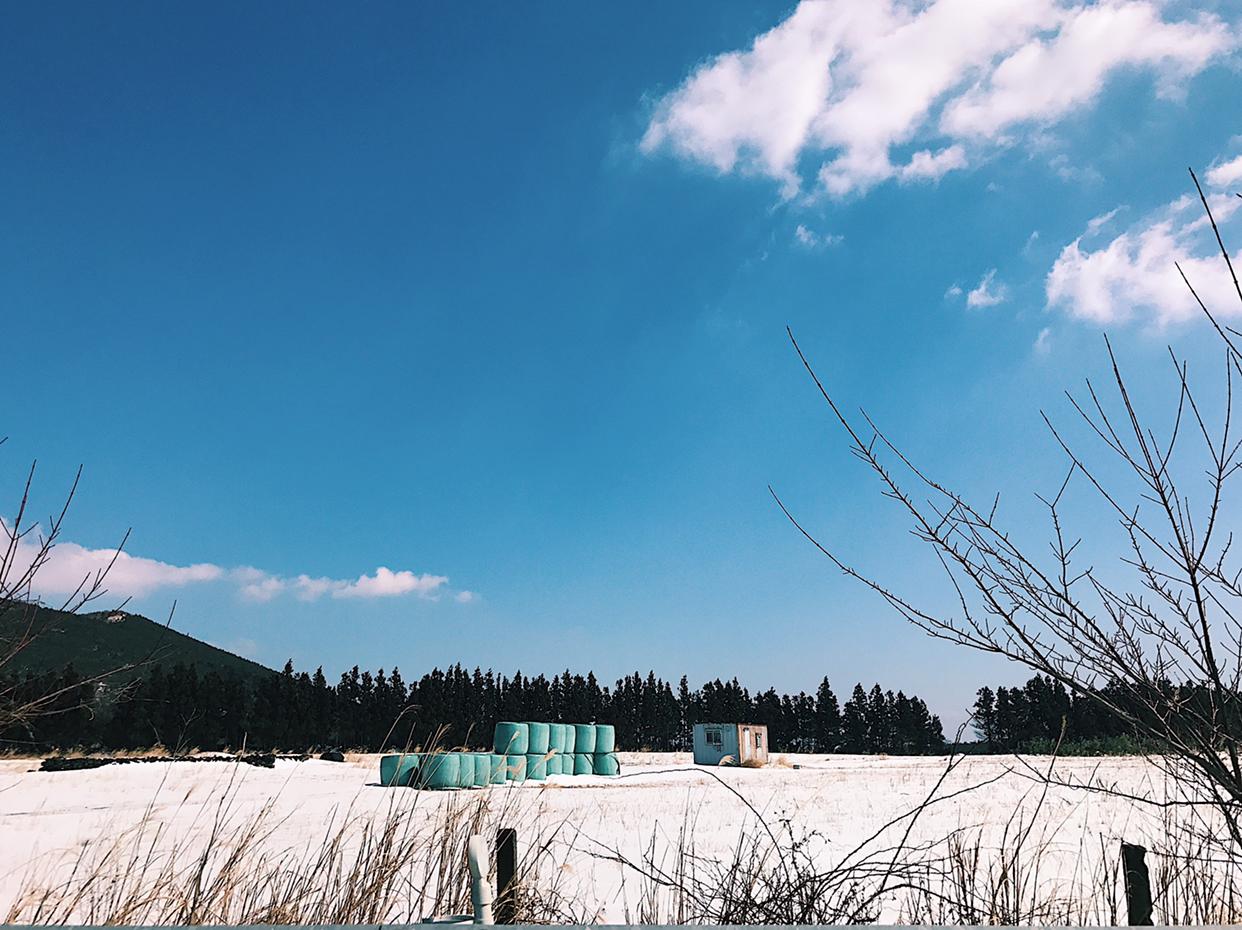 하얀 겨울의 색의 끄트머리에 다다른, 녹기만을 준비하는 시한부 눈들로 덮인 , 겨울과 봄 그 어딘가의 섬 제주에 왔다. 쌓인 눈과 맞닿은 하늘이 이루는 너그러운 직선을 따라 그만 시선을 빼앗기고 만다.
