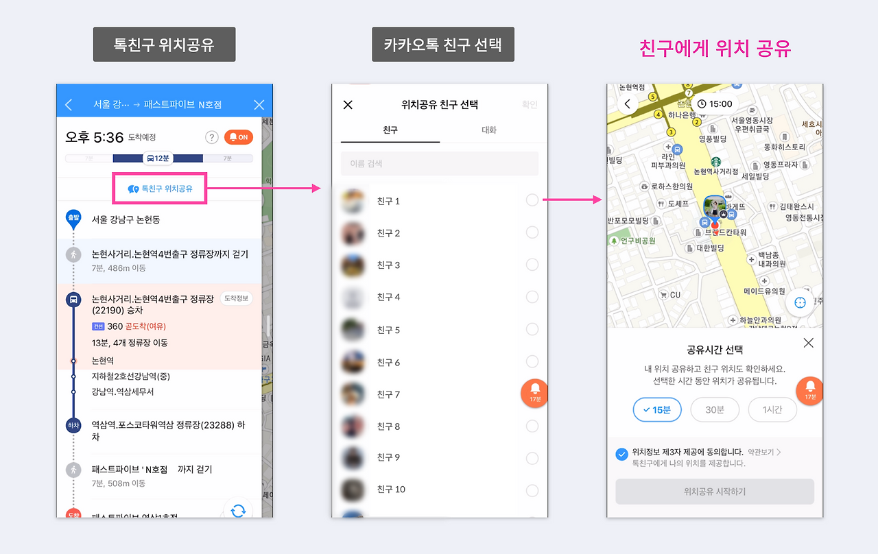 1)톡친구 위치공유 버튼을 클릭한다 -> 2)위치를 공유할 친구를 선택한다 -> 3)공유시간을 선택한다
