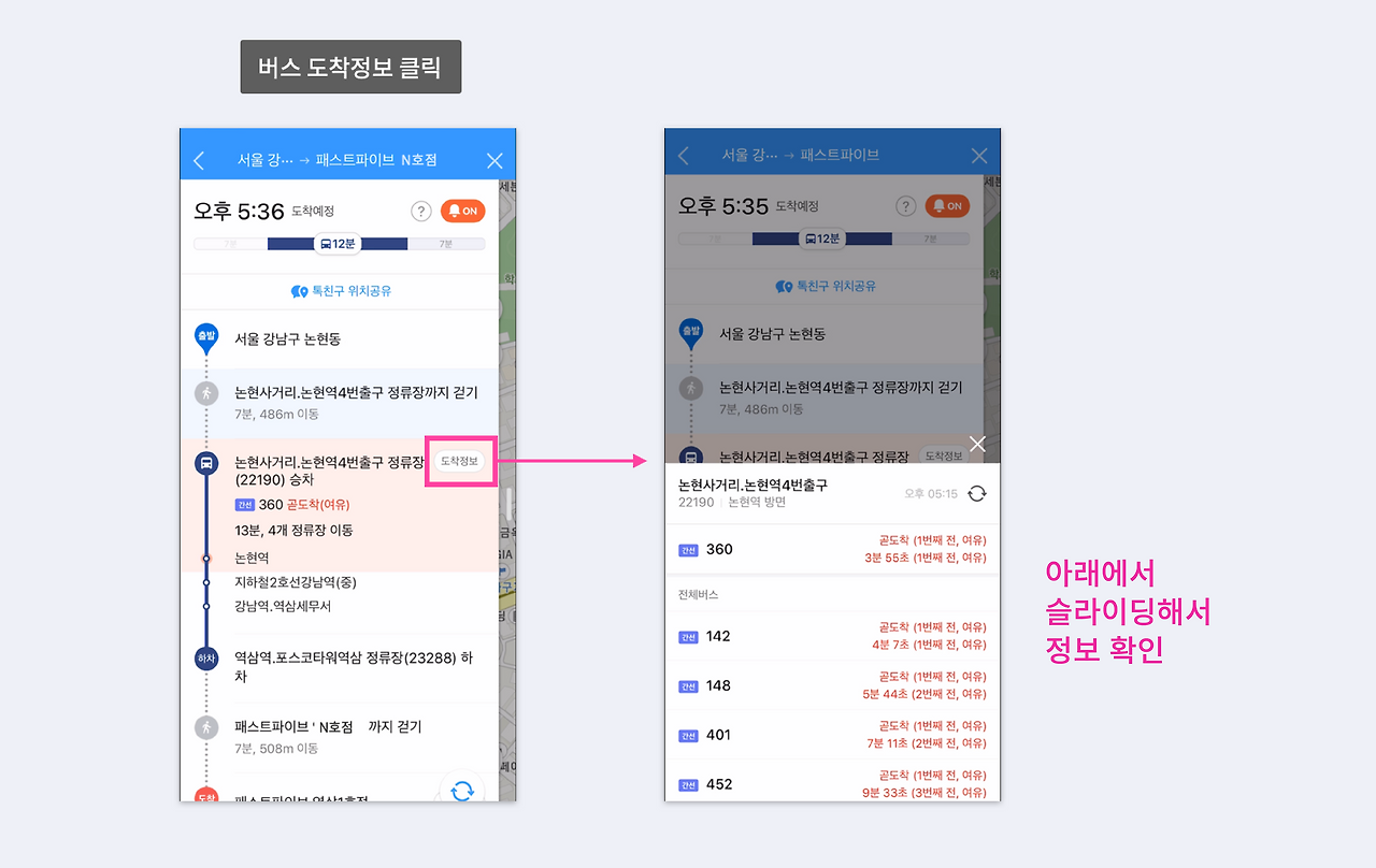 도착정보 버튼을 탭하면 하단에서 위로 슬라이딩해서 화면 높이의 반정도 덮는 테이블뷰가 나와요. 여기서 1)현재 내가 타고자하는 버스가 몇분후에 오는지랑 2)해당 정류장에서 다른 버스들은 뭐가 있고 언제 도착하는지 정보들이 나와요.