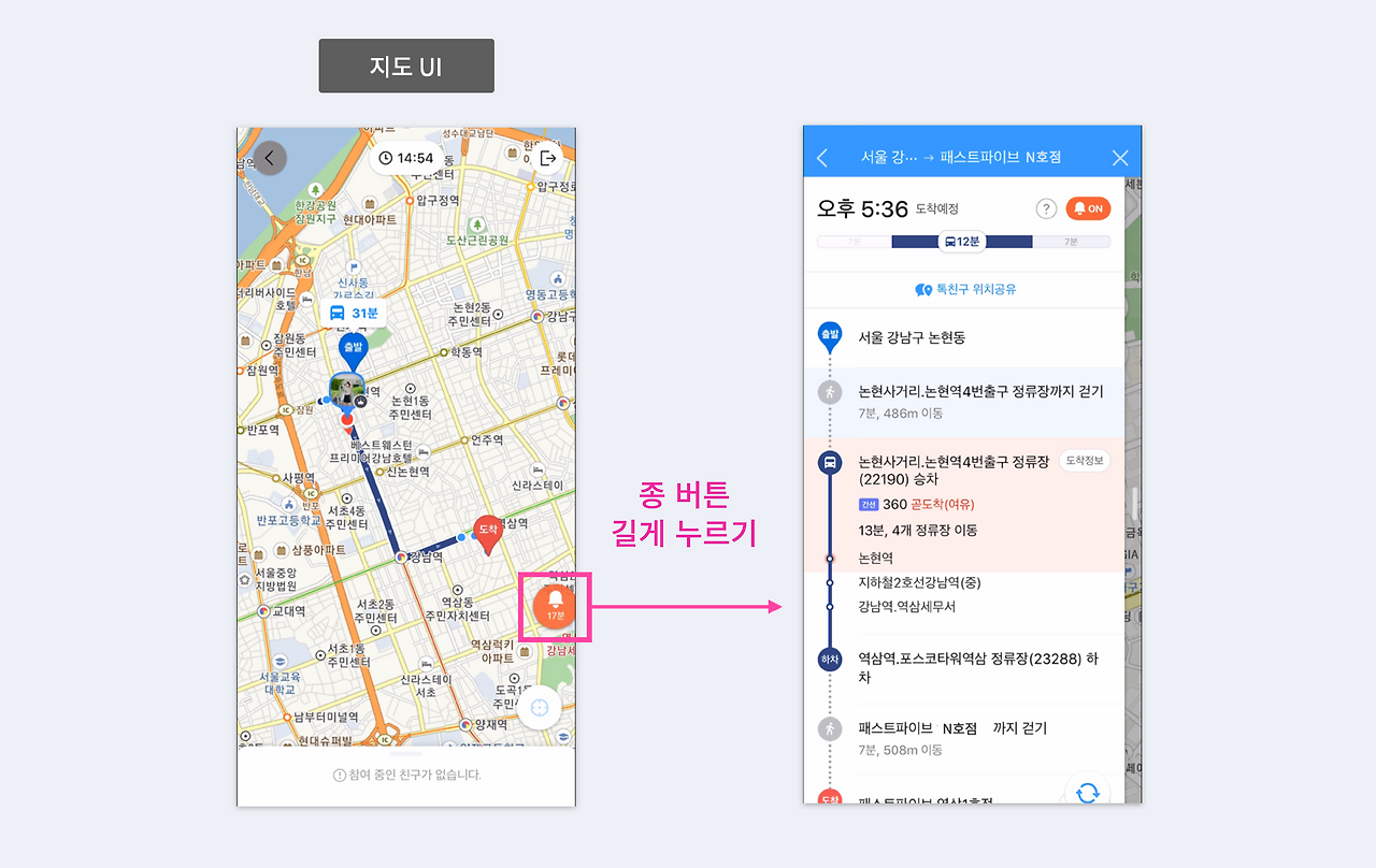 다시 버스 경로를 리스트로 보고싶으면, 지도 위에 동그란 종모양 버튼 보이시나요? 그 버튼을 꾸욱 길게 누르면, 다시 버스 경로를 리스트로 볼 수 있습니다. 트랜지션하는 UX도 매끄럽고 직관적이었어요.