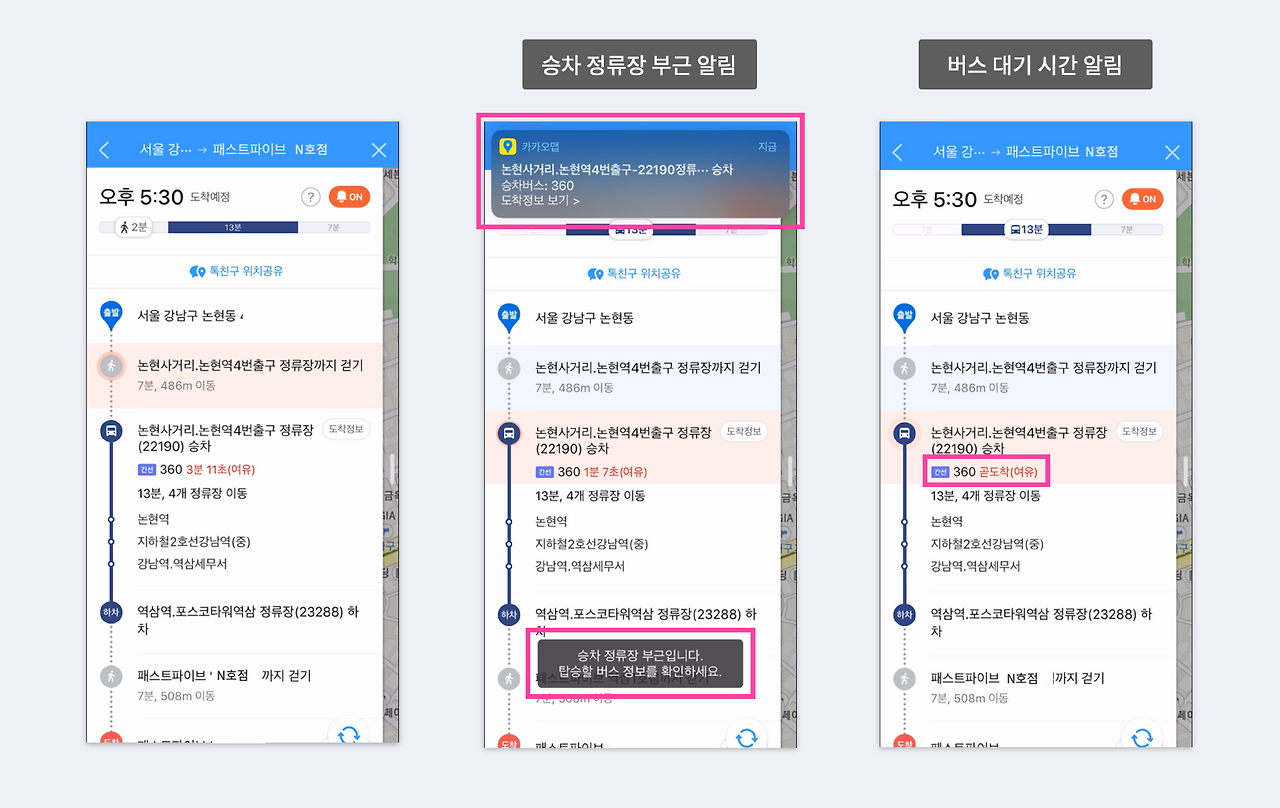 승차해야하는 정류장 부근이 오면, 위 스크린샷의 가운데 화면처럼 푸시 노티와 화면 내 토스트로 알려줘요.