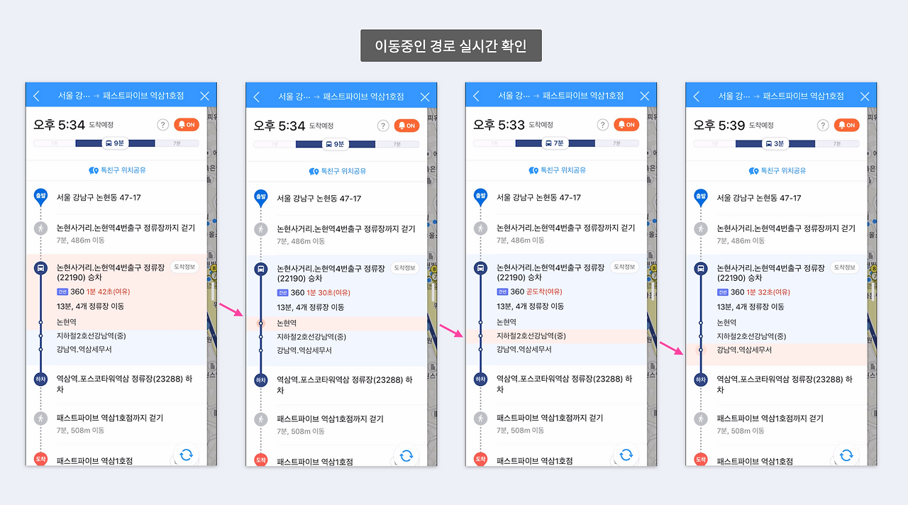 승하차 알림기능 외에 위치공유, 버스 도착시간 정보, 지도 UI 등 하나하나 디테일이 살아있는 UX였습니다. 심지어 애니메이션까지 Hi-fi로 잘 구현되어 있는 것까지!
