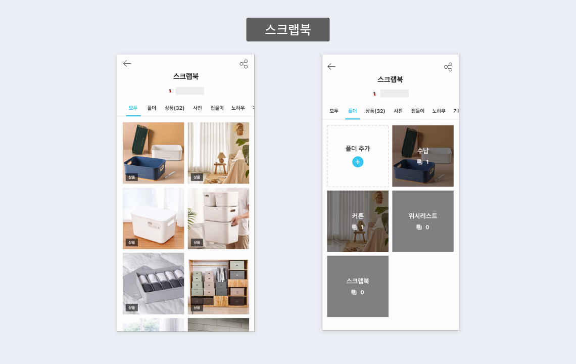 좀 더 스크롤 다운하면, 스크랩북이 모아져서 나오는데 저는 이 스크랩북 완전 최애... 요새 이것저것 사고 싶어서 수납, 커튼 등 종류별로 마음에 들었던 것들을 담아뒀어요.