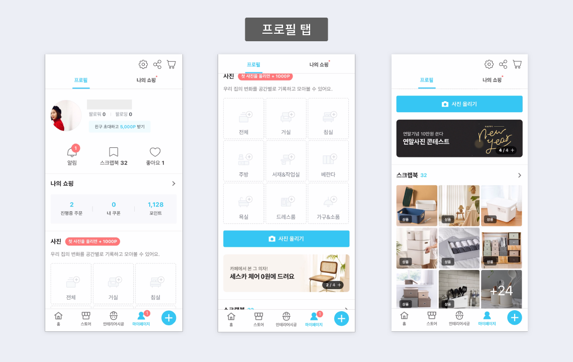 사진 업로드 유도를 많이 하기 위해, '첫 사진 올리면 1000포인트 지급'혜택까지 있네요! (저도 제 방부터 하나씩 올려봐야겠어용 ㅎㅎ) 여기에 올리는 소품,상품들이 위에서 살짝 언급한 상품 상세페이지의 스타일링샷에도 적용되는 것 같아요!