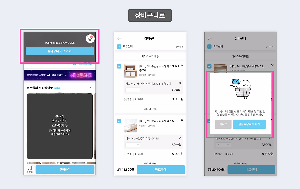 이번엔 상단으로 회색배경으로 장바구니 담겼다는 안내가 나와요. 장바구니 화면으로 유도를 잘 하고있음을 볼 수 있어요. 유도한 대로 따라서 장바구니로 가니, 귀여운 고양이 모달창이 나와요. "장바구니에 담긴 상품으이 특가 정보 및 개인 맞춤 정보를 준다고 하네요!"