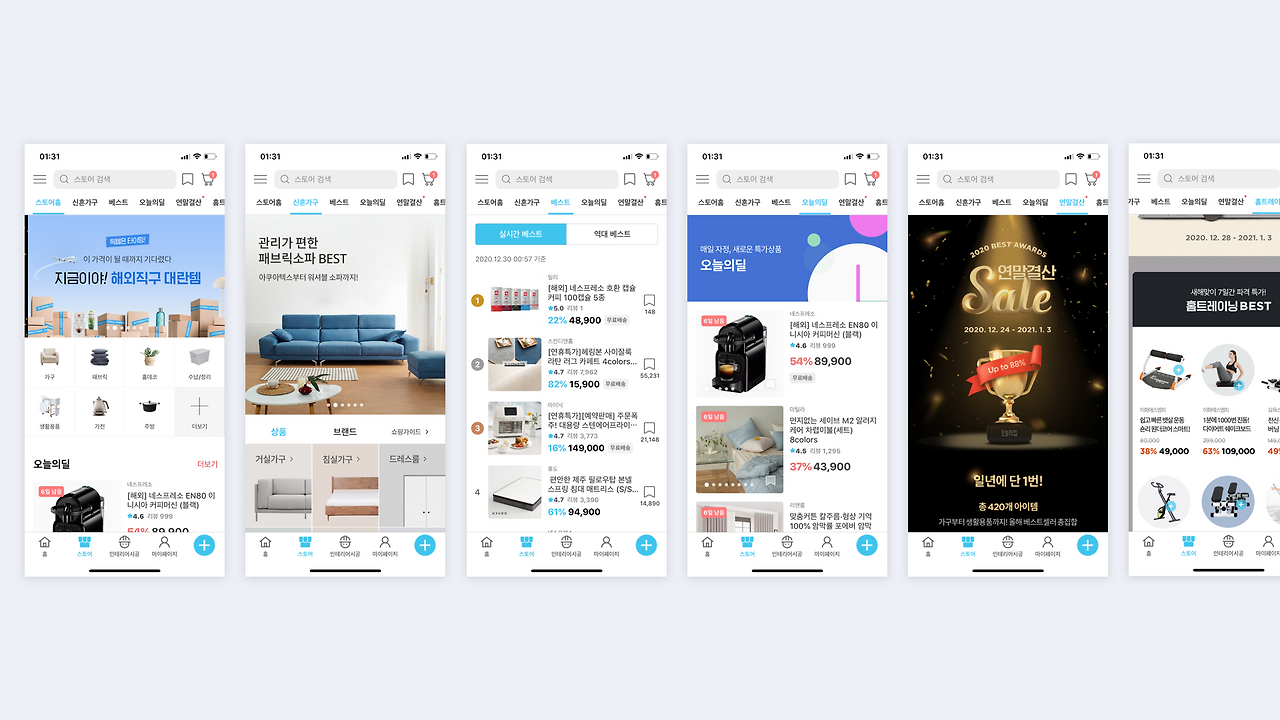 상단 메뉴 탭부분만 가볍게 설명하면, 스토어-신혼가구-베스트-오늘의딜-연말정산-홈트레이닝-기획전 순서로 있어요.