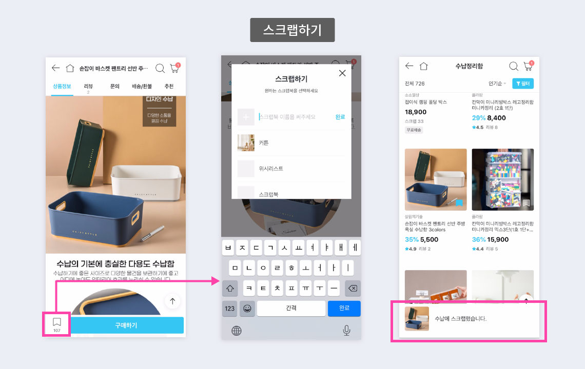 그리고 오늘의 집에는 스크랩하기 기능이 있는데요. 일반적으로 커머스쪽에서 "찜하기"기능하고 비슷한 느낌이에요. 하지만, 찜하기와 차별점은 스크랩북을 여러개 만들어서 유형별로 정리할 수 있어요.