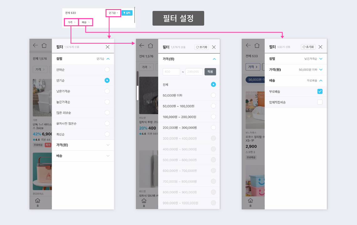 내가 원하는 조건안에서 상품 검색할때 필터 많이들 사용하시죠. 오늘의집 스토어쪽도 정렬,가격,배송에 따라 원하는 조건을 설정할 수 있게 되어 있어요.