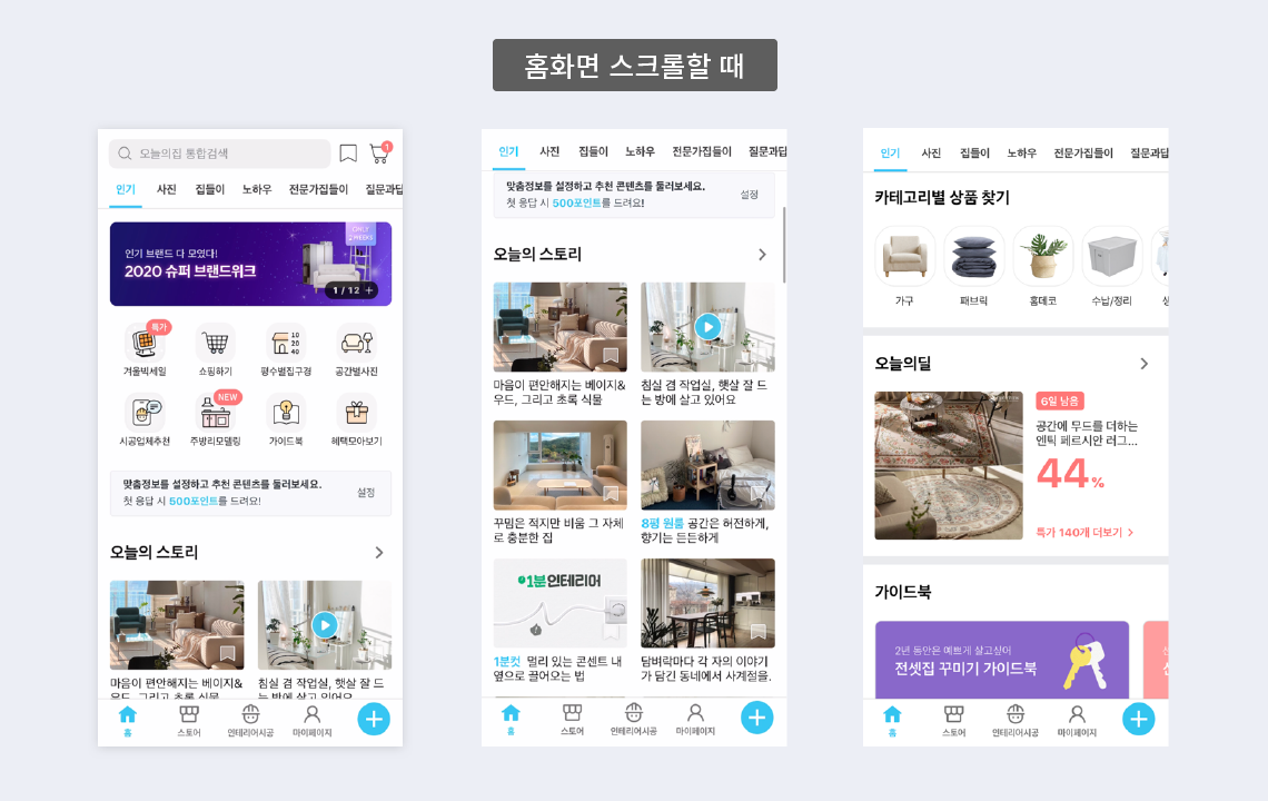 메인화면(홈탭)을 보면 오늘의집이라는 앱에서 어떤걸 강조하고 싶은지를 차례로 볼 수 있어요.