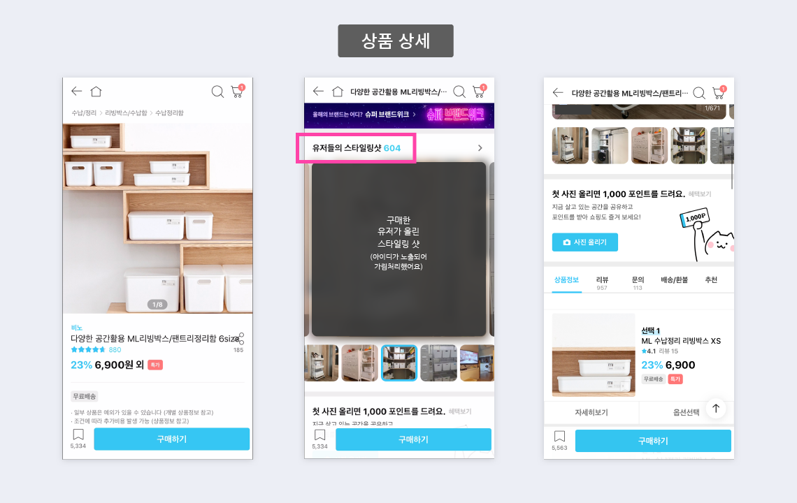 인테리어 관련 상품 살때는 특히 배치나 디자인 등 다른 사람들이 사용한 샷 보면 도움이 많이 되지 않나요? 저는 오늘의 앱에서 직접 수납함을 구매하면서 스타일링샷 부분에서 특히, '이정도 공간에 이렇게 쓰는구나...이렇게 매칭해도 예쁘구나, 내 방에도 어울리겠지?' 라는 팁을 많이 얻었던 것 같아요. 상품 구매할 때 상세페이지에서 "유저들의 스타일링샷" 참고해서 구매해보세용!