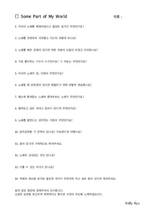 좋아하는 가수, 장르를 묻고 , 도전하고 싶은 곡 등을 묻는 건 전체적인 학생의 취향을 파악하기 위해서이지만 학생의 첫 노래를 듣고 난 다음에야 그 취향을 더 정확하게 파악할 수 있습니다. 혹시 많은 아티스트나 장르를 접해 보지 못해서라면 접할 수 있게 취향을 고려하여 좋아할 만한 여러 곡을 추천합니다.