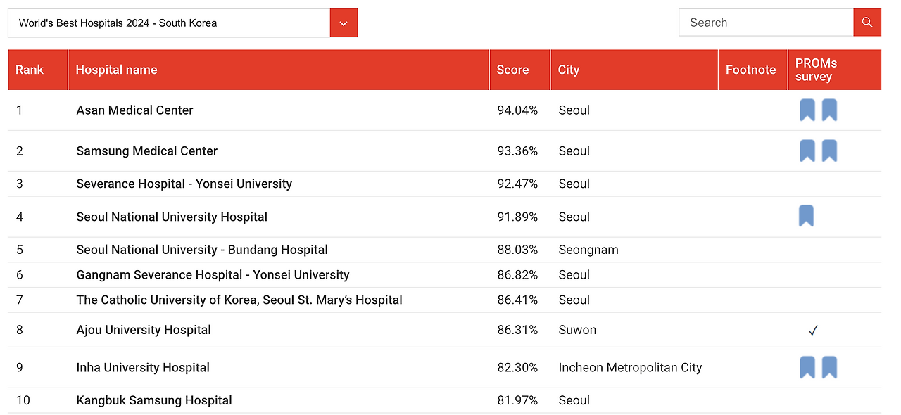 궁금하신 분들이 있을 것 같아 국내 병원의 순위도 한번 확인해보았습니다.