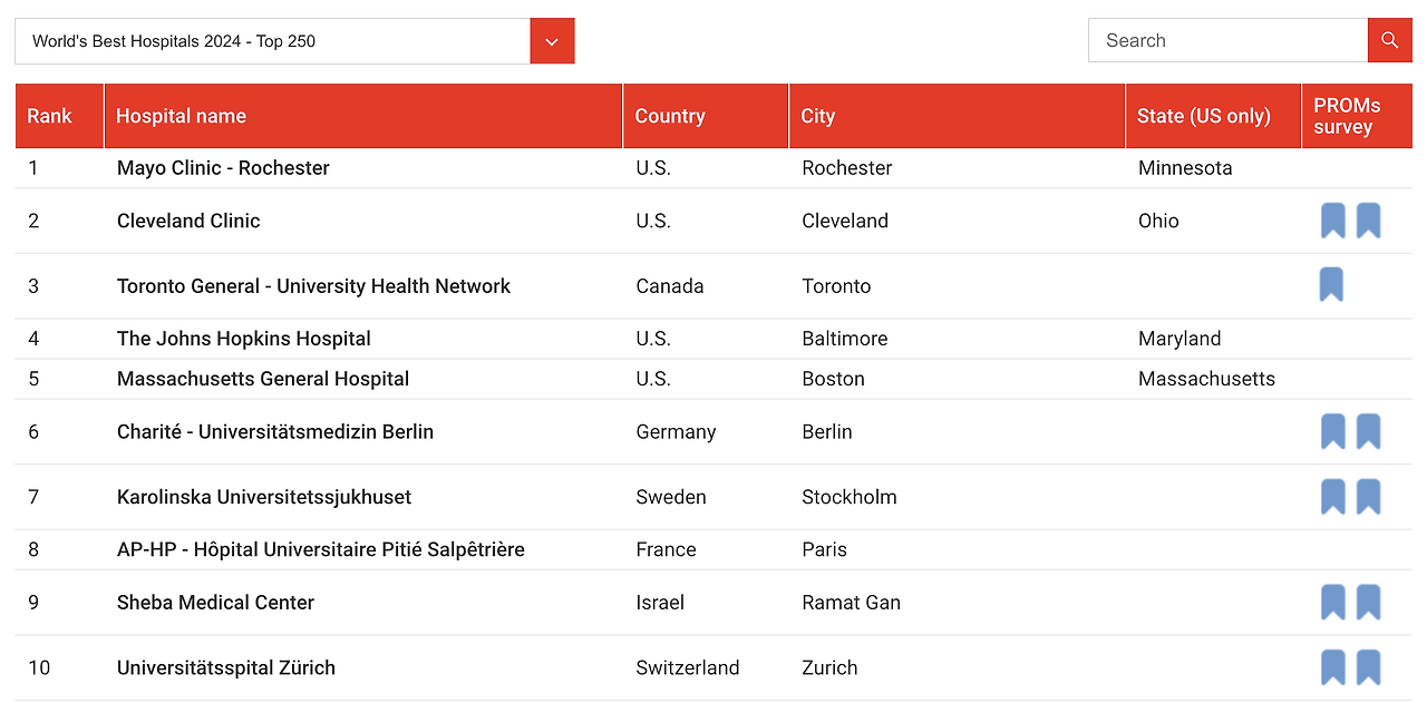 우리나라 사람들에게 잘 알려져 있지 않지만, 현재 세계 1위 병원은 미국 미네소타주의 로체스터라는 도시에 있는 Mayo Clinic, Rochester 입니다. 매년 Newsweek에서 병원평가를 진행하는데, 전세계적으로도 공신력이 있는 평가로 여겨지고, 실재로 병원들도 해당 목록에서 순위가 높게 매겨진다면 이를 활용하여 홍보를 하기도 합니다. 아래의 사진이 바로 2024년 Newsweek 전세계 병원 평가 Top 250 입니다.