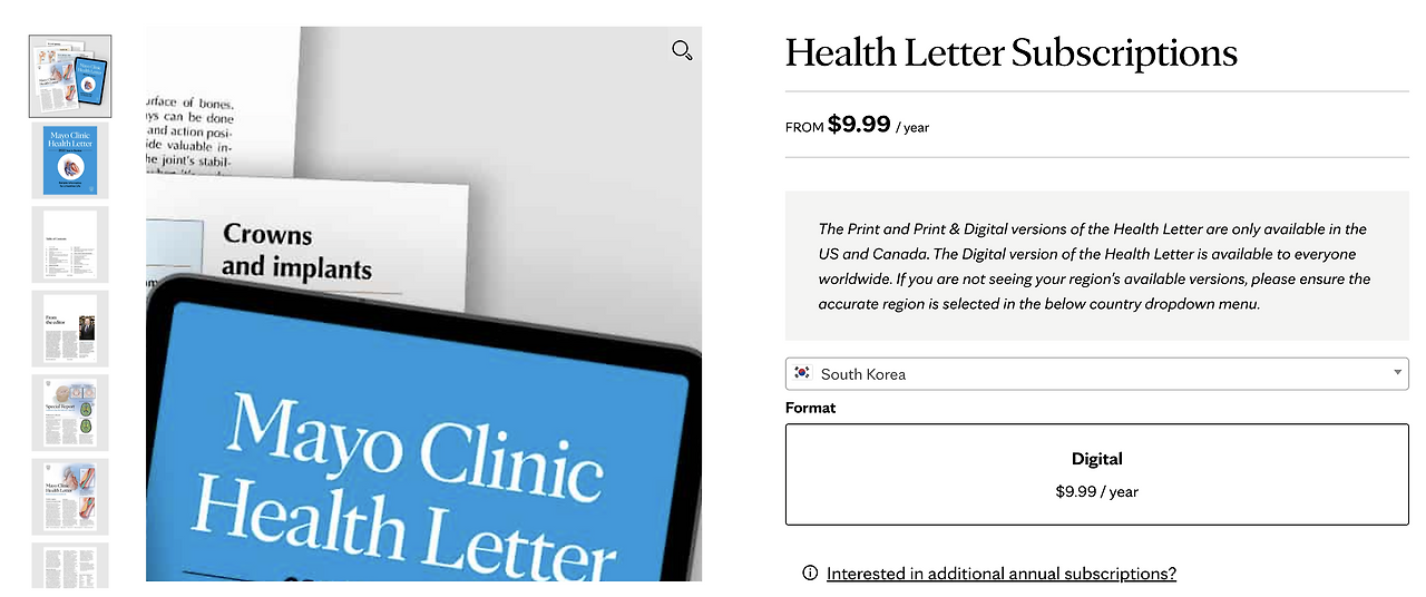 이런 어려움을 극복하게 해주고자, Mayo Clinic 에서는 Health Letter라는 월간지를 발행하고 있습니다. 아래에서부터는 쉽게 건강 편지라고 지칭하겠습니다. 아래의 사진을 보면, Mayo Clinic에서 건강편지를 질에 비하여 굉장히 저렴한 가격에 발행하고 있는 것을 알 수 있습니다. 한국에서는 종이잡지 형태로 배송받을 수는 없으며, pdf 형태로만 받아서 볼 수 있습니다. 월간지는 8~10 장의 분량으로 구성되어있으며 3~5개의 소주제들로 구성되어있습니다.