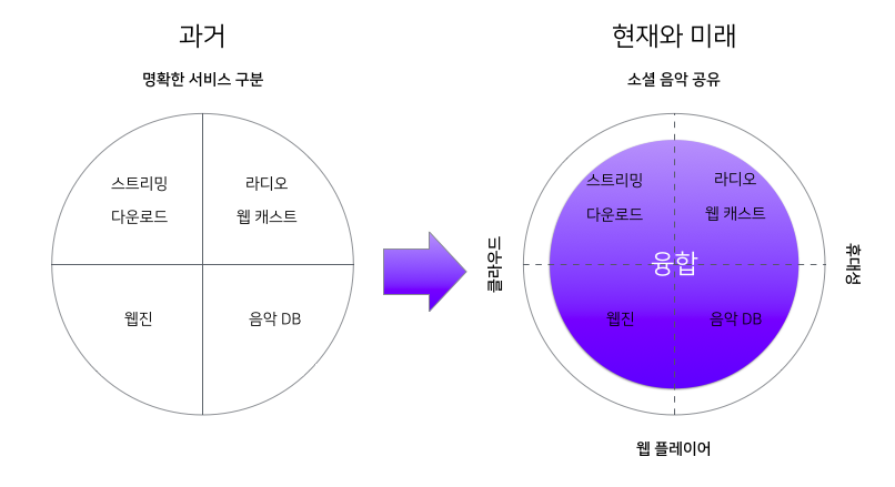과거에는 다양한 서비스 간에 역할이 분명했다면, 이제는 다양한 서비스가 융합의 형태로 서로 커뮤니케이션하고 있다. 미래도 아니고, 이미 지금 일어나고 있는 일들이다. 음악 서비스들은 위에서 언급했던 와우 팩터들을 가지고, 다양한 소셜 연결, 그리고 서비스 간 연결을 통해 이제 새로운 형태로 진화해나가고 있다.