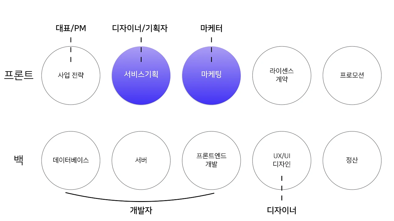 조금 더 실무적인 이야기를 해보자. 사업 전략에 대해서는 회사의 C레벨이나 프로젝트의 매니저가 담당하게 될 것이고 서비스의 전체적인 그림과 숫자를 통해서 어떻게 이 서비스를 통해 수익을 내고, 또 비전을 실현할 것인지에 대해서 많은 준비가 필요하다. 서비스 기획은 우리나라 IT 업계에서만 볼 수 있는 기획자 포지션의 인력이 담당하거나 디자이너가 맡는다. 마케팅과 프로모션은 마케터가 수행하게 되는데, 최근에는 과거처럼 TV나 신문 매체에 대한 마케팅 이해가 필요한 것이 아니라 페이스북, 유튜브 등 다양한 온라인 채널의 미디어 리터러시가 있는 마케터가 해당 역할을 잘 수행해낸다. 서버와 데이터베이스는 백엔드 개발자가 담당하게 되는데 우리 눈에는 보이지 않는 이 백엔드 부분도 서비스 기획 단계부터 잘 설계되어야 한다. 더불어 서비스 기획에서 나온 레이아웃들을 실제 디자이너의 디자인을 입혀서 웹이나 앱 서비스로 개발하는 과정을 거친다. 그래서 프론트앤드 개발자와 디자이너는 이 과정에서 다양한 방식으로 커뮤니케이션하게 된다.
