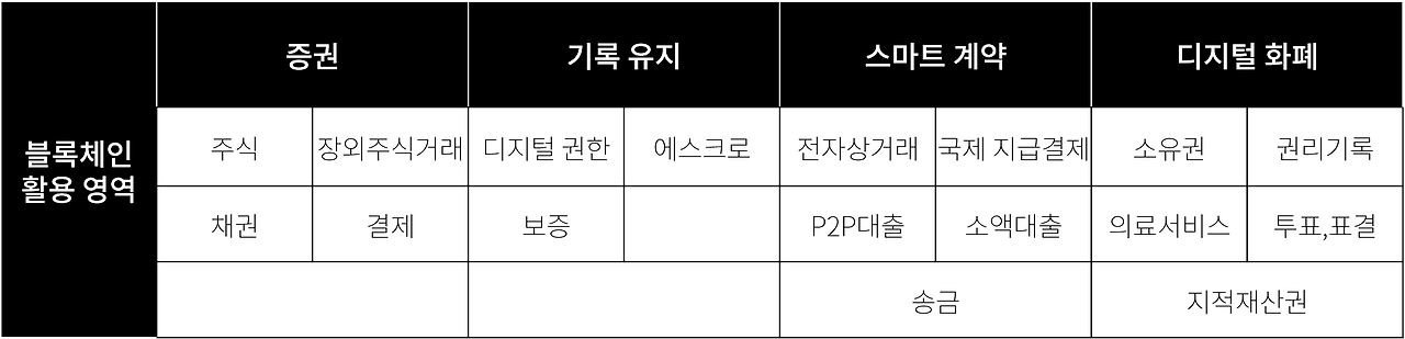 블록체인을 통해 활용될 수 있는 영역은 다음과 같다.