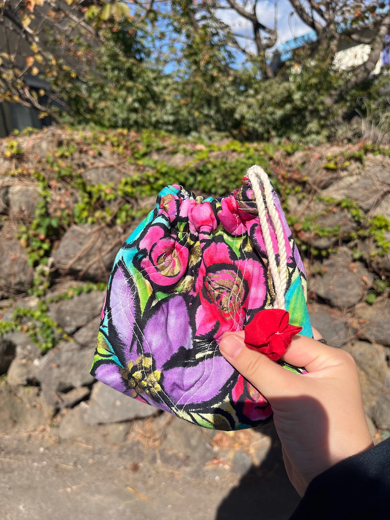 큰 핀에 끈을 연결해 우리가 맨 처음에 만들어둔 끈 자리에 쏙 하고 넣으면, 나는 돈 주고도 살 만하다고 여기는 파우치가 완성된다! 끈 끝에는 마찬 가지로 재봉틀과 약간의 솜, 손 바느질을 보태 꽃망울도 하나 달아 주었다.