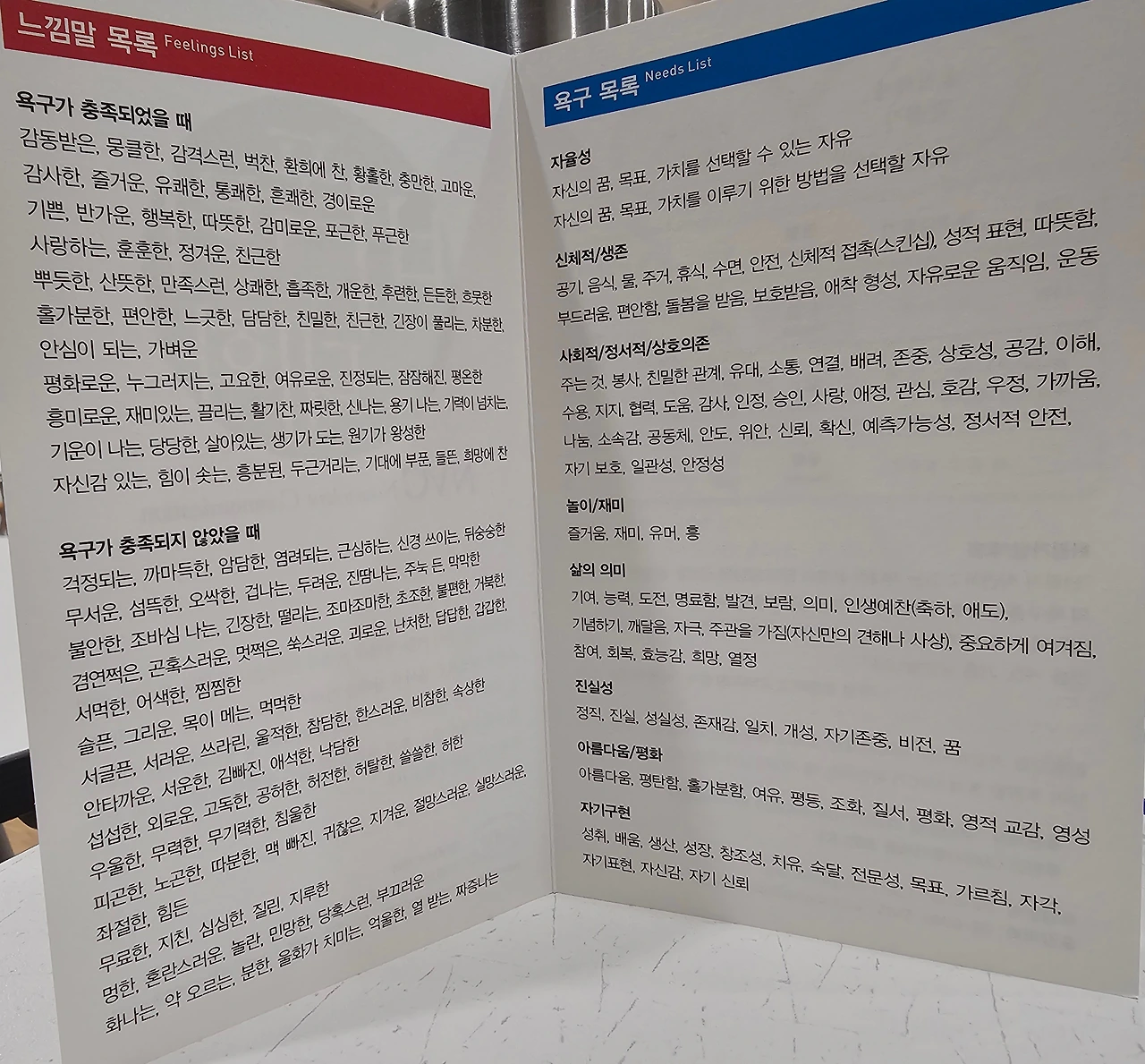 워크샵 가기 전날 복습용으로 들은 유튜브의 비폭력대화 설명을 추가로 듣고 나서야, 여기서 사용하는 단어들이 익숙해졌다.